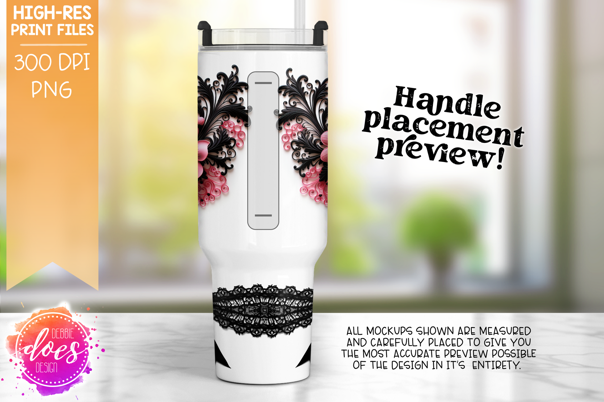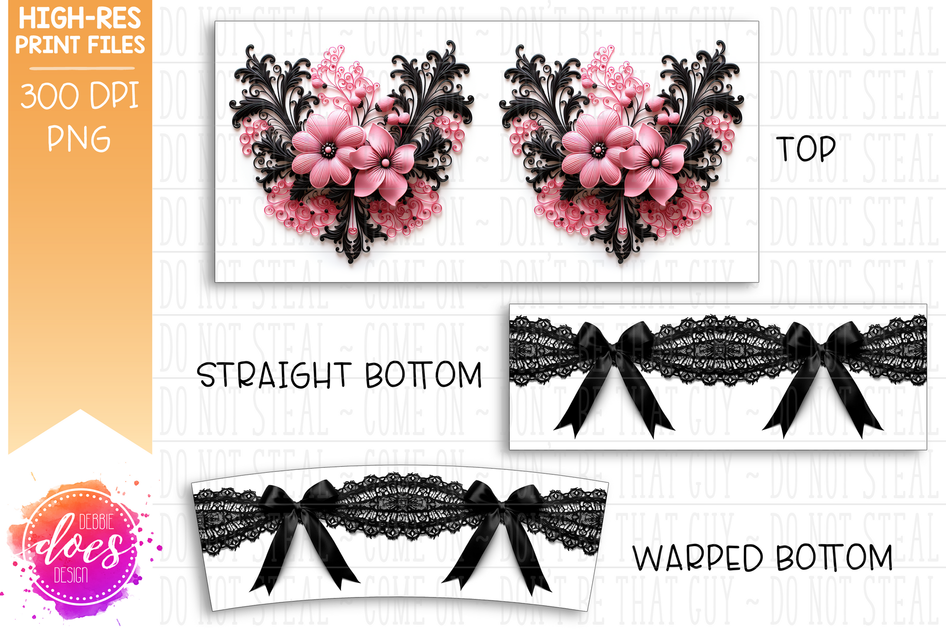 3D Hot Pink & Black Flowers with Lace Bow - 40oz Tumbler - Seamless - Printable/Sublimation Design