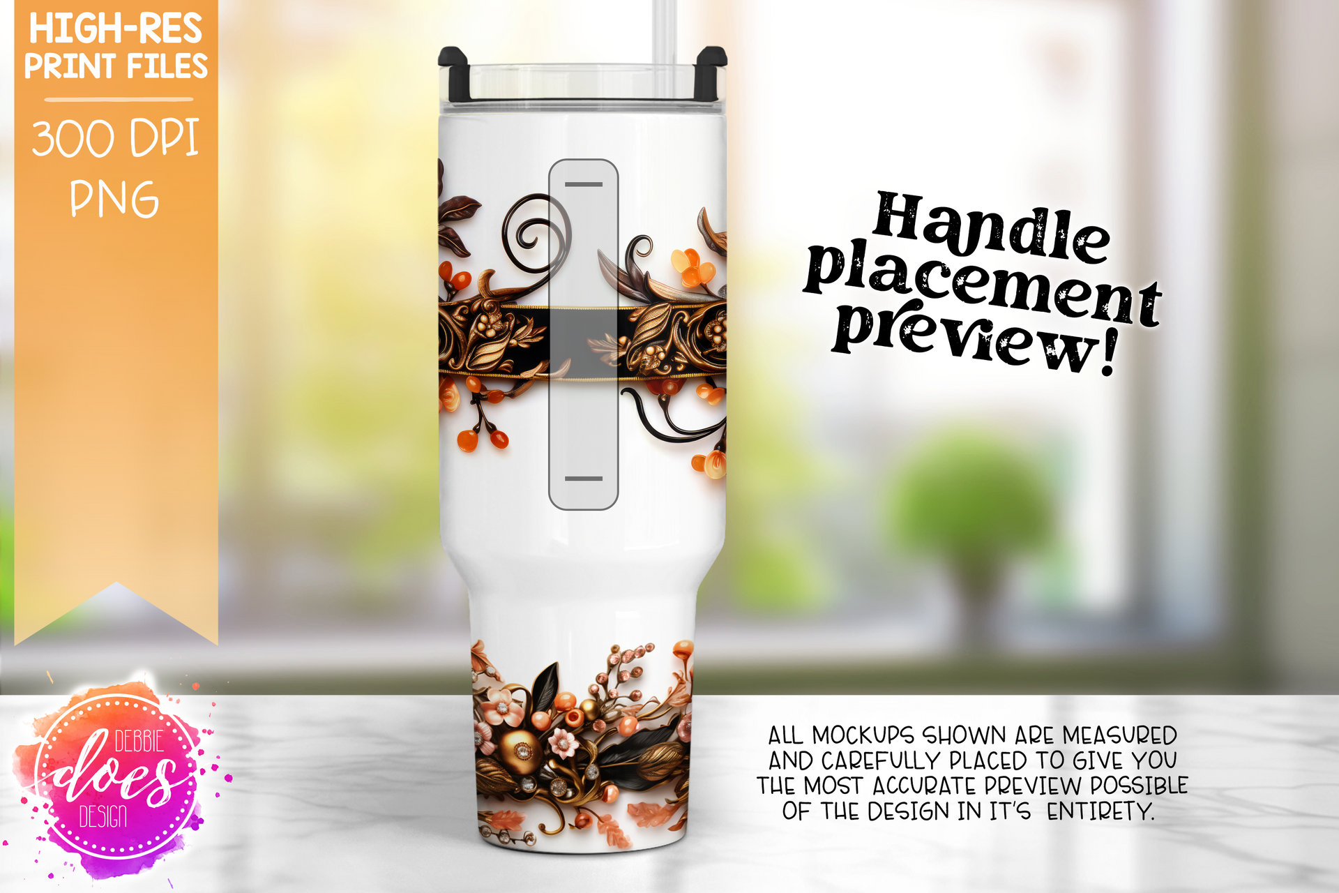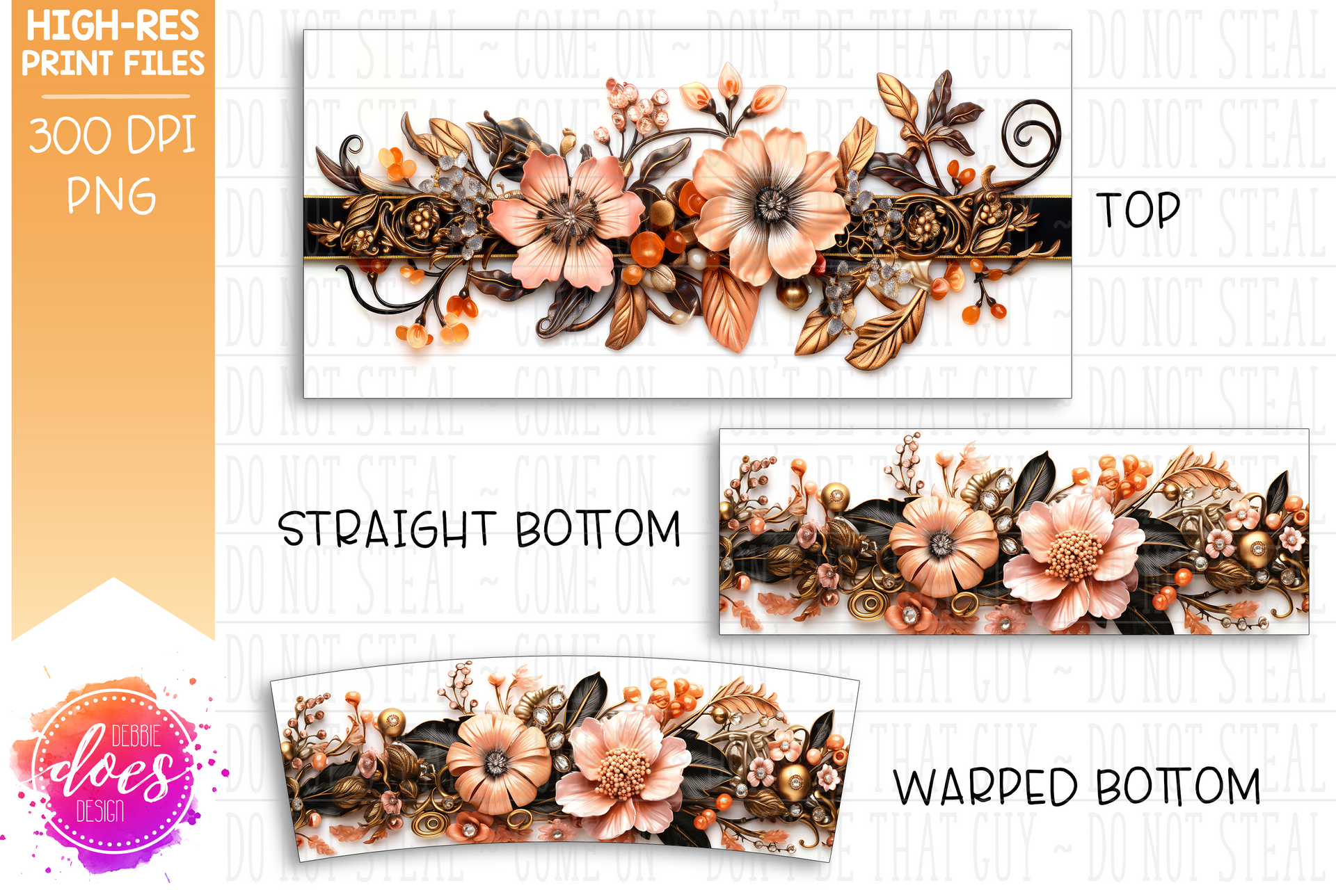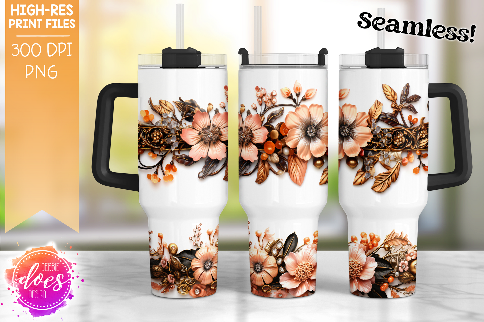 3D Peach Orange Black Floral - 40oz Tumbler - Seamless - Printable/Sublimation Design