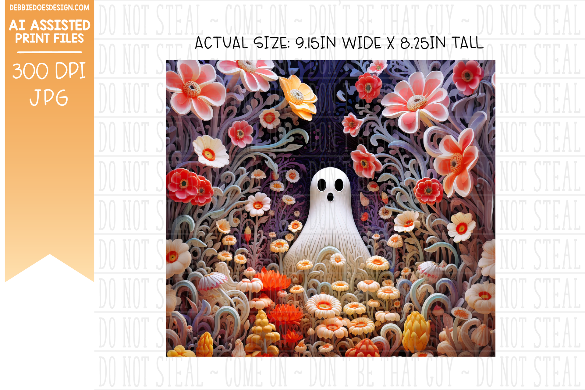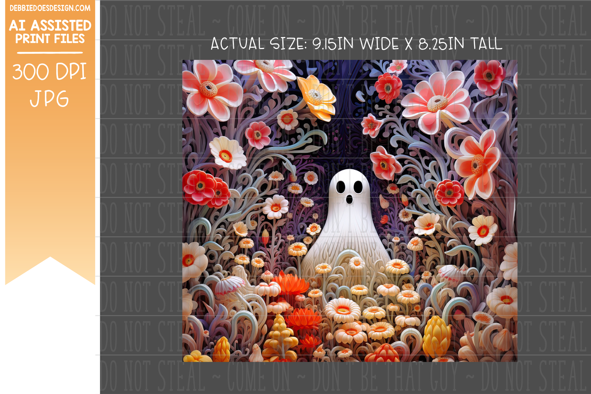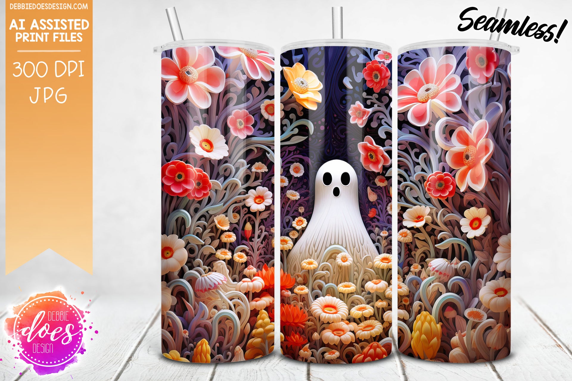3D Clay Ghost and Flowers 5 - Tumbler - Seamless - AI Assisted Printable/Sublimation Design