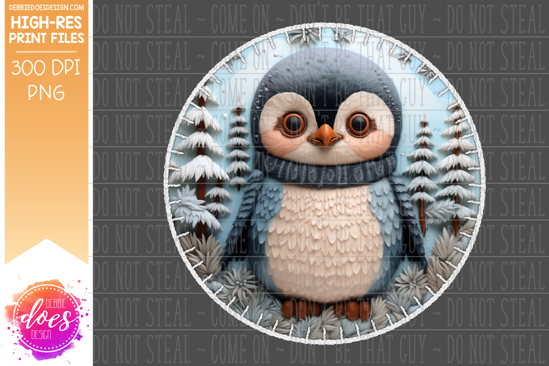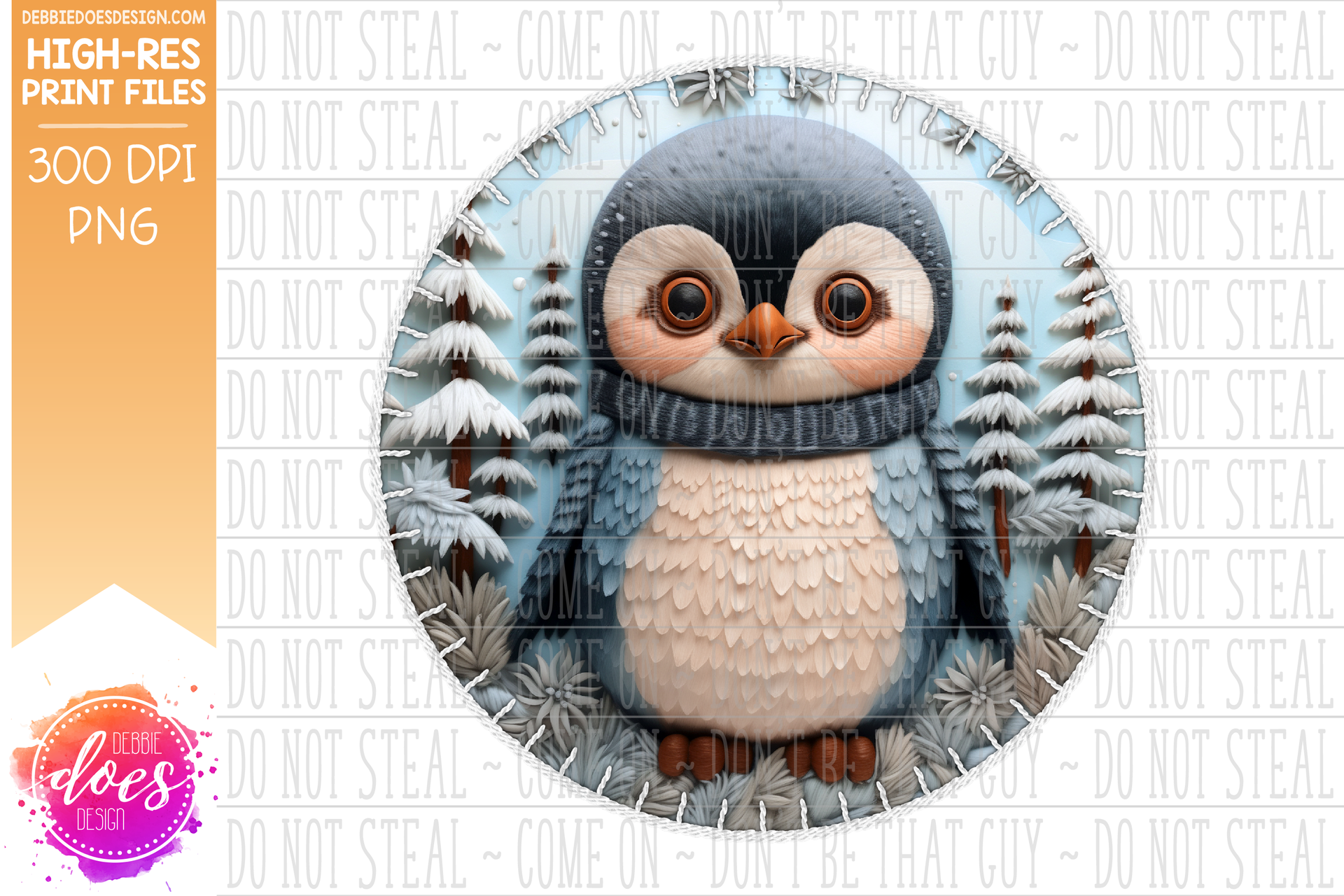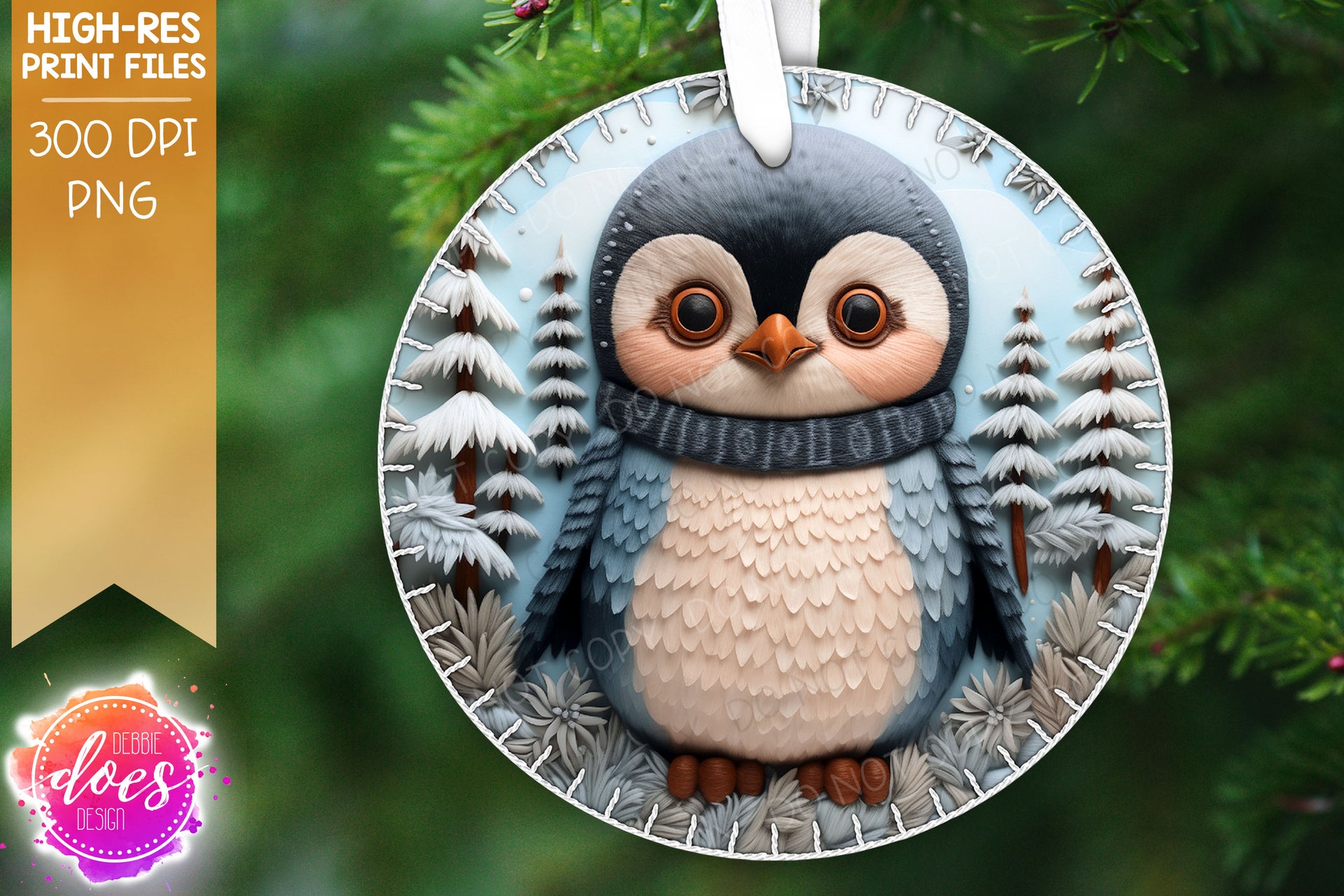 3D Felt Circle Ornament - Winter Forest Penguin - Sublimation/Printable Design