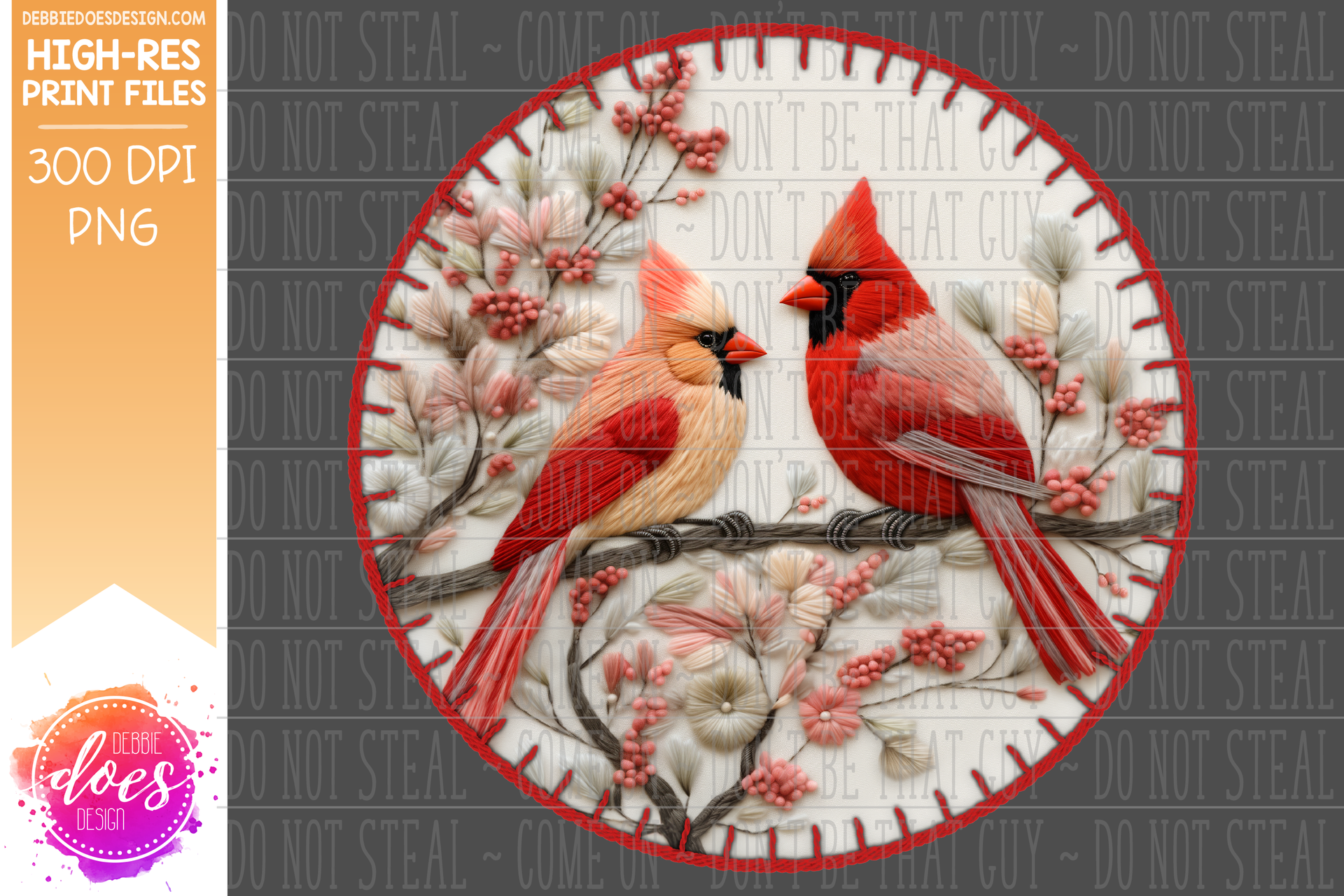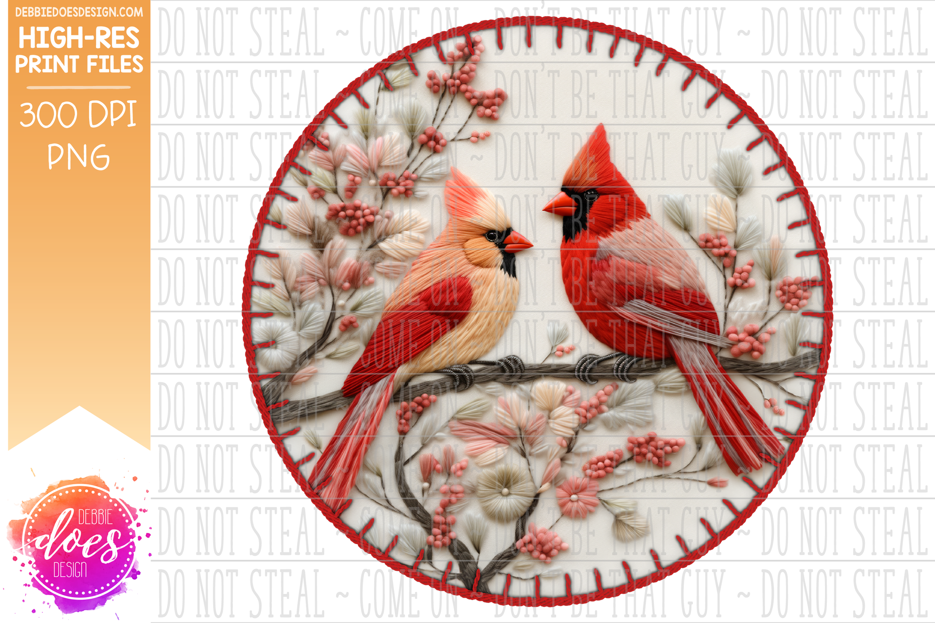 3D Felt Stitched Ornament - Cardinal Pair - Red - Sublimation/Printable Design