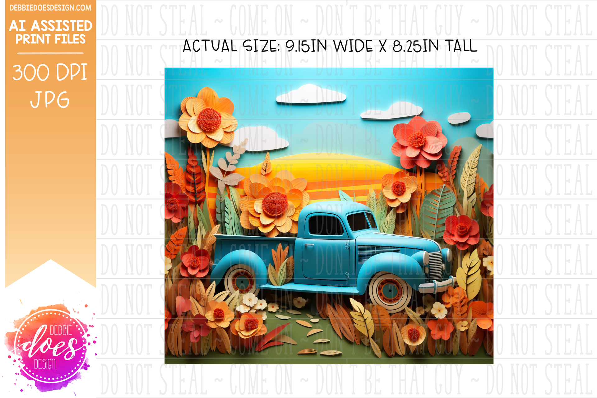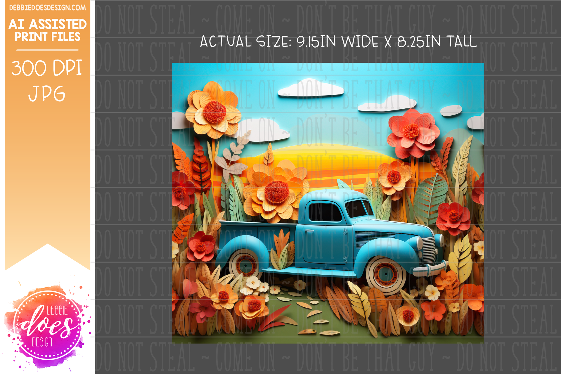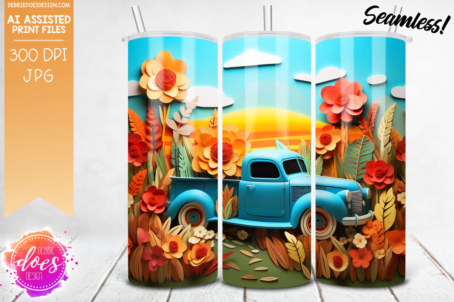 3D Paper Blue Truck Flowers - Tumbler - Seamless - AI Assisted Printable/Sublimation Design