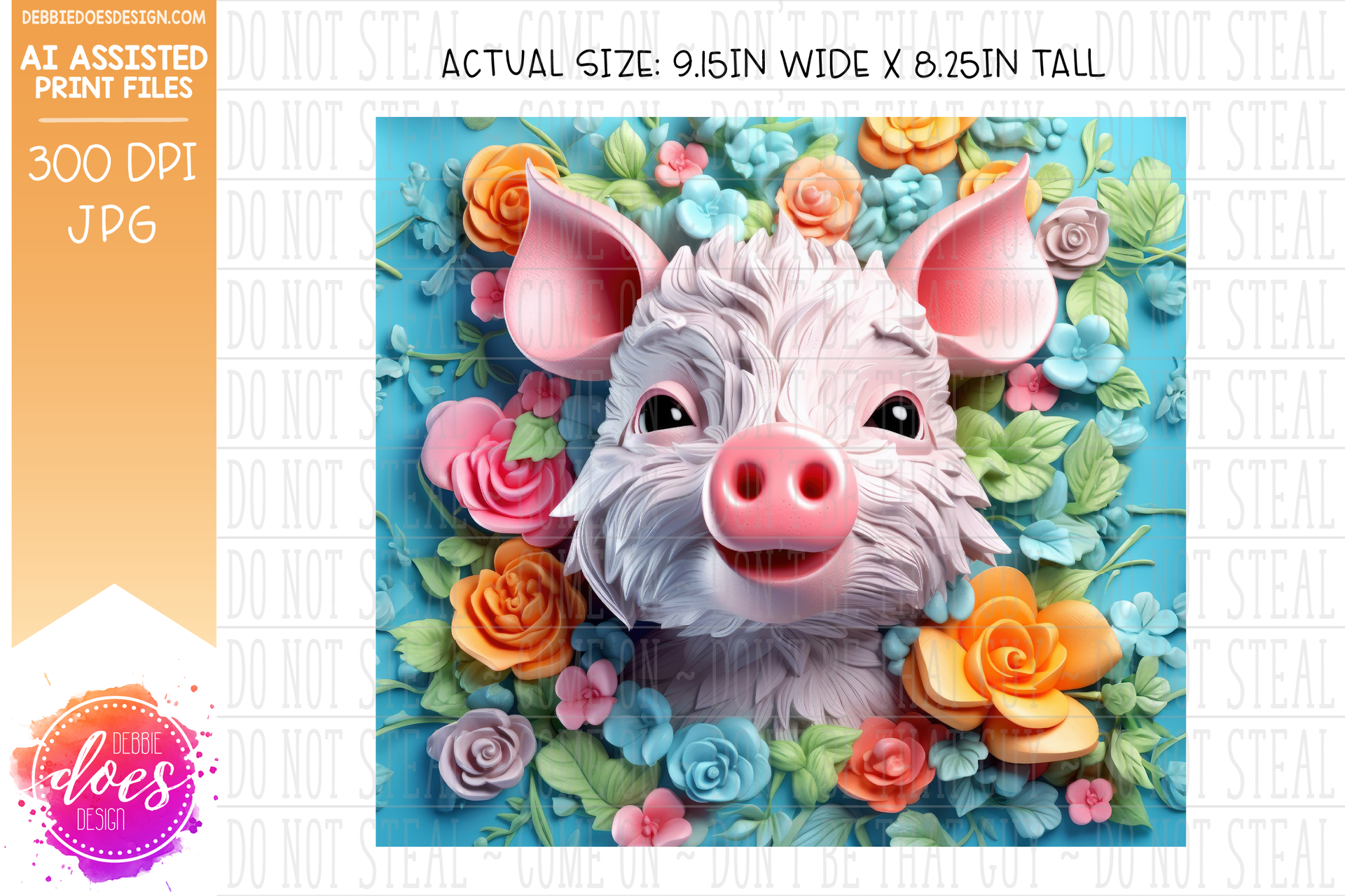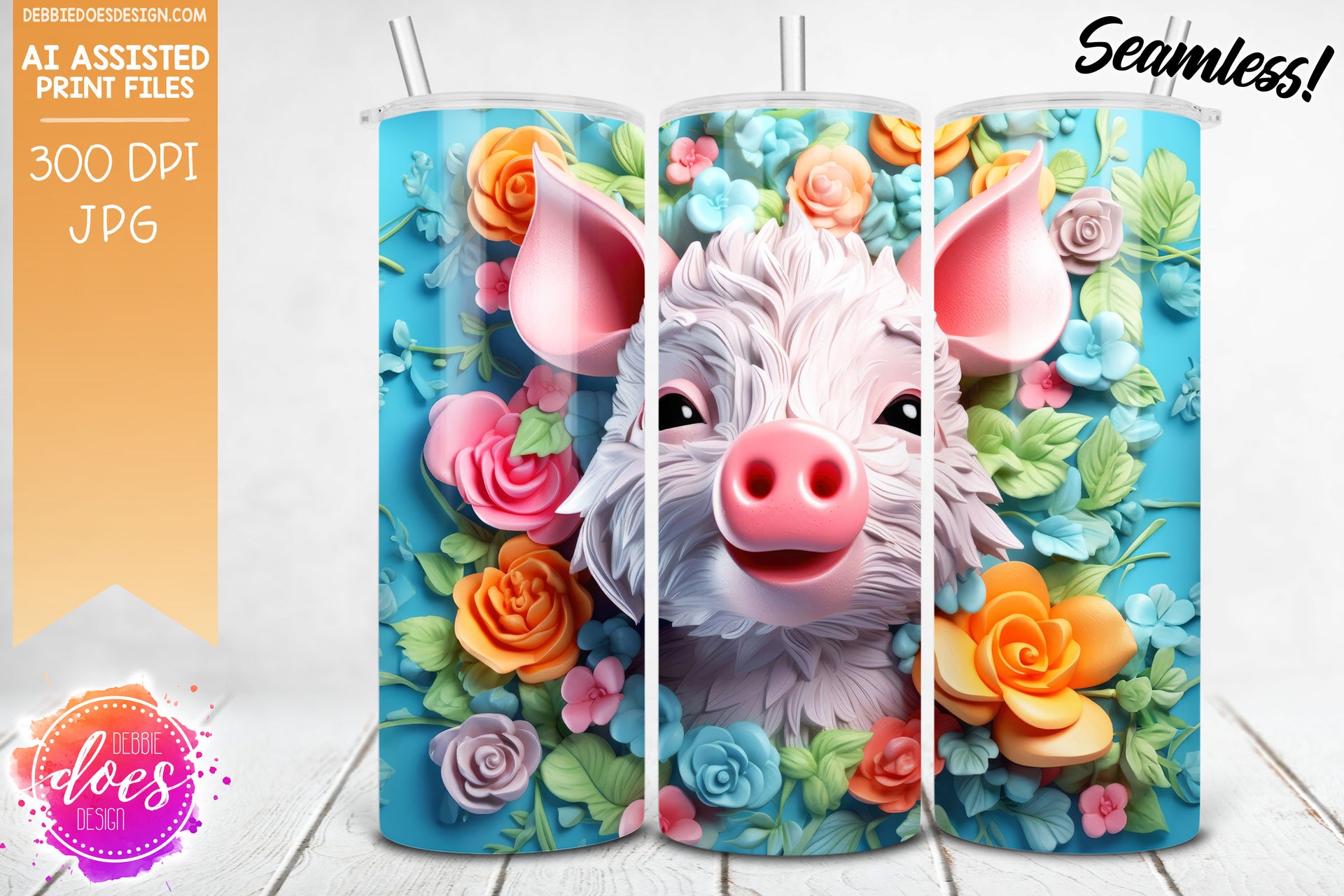 3D Sculpted Art - Pig with Flowers - Blue - Tumbler - Seamless - Printable/Sublimation Design