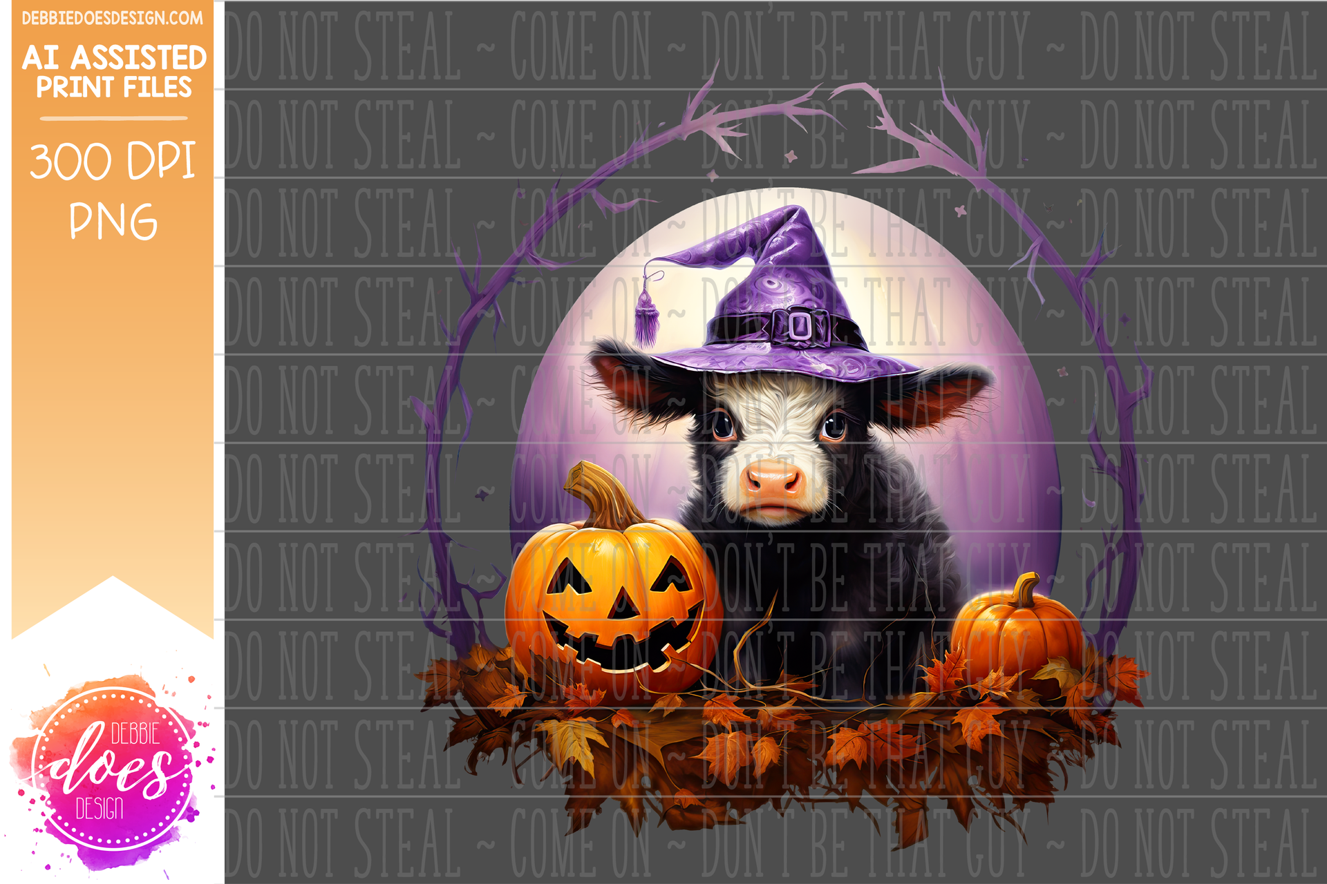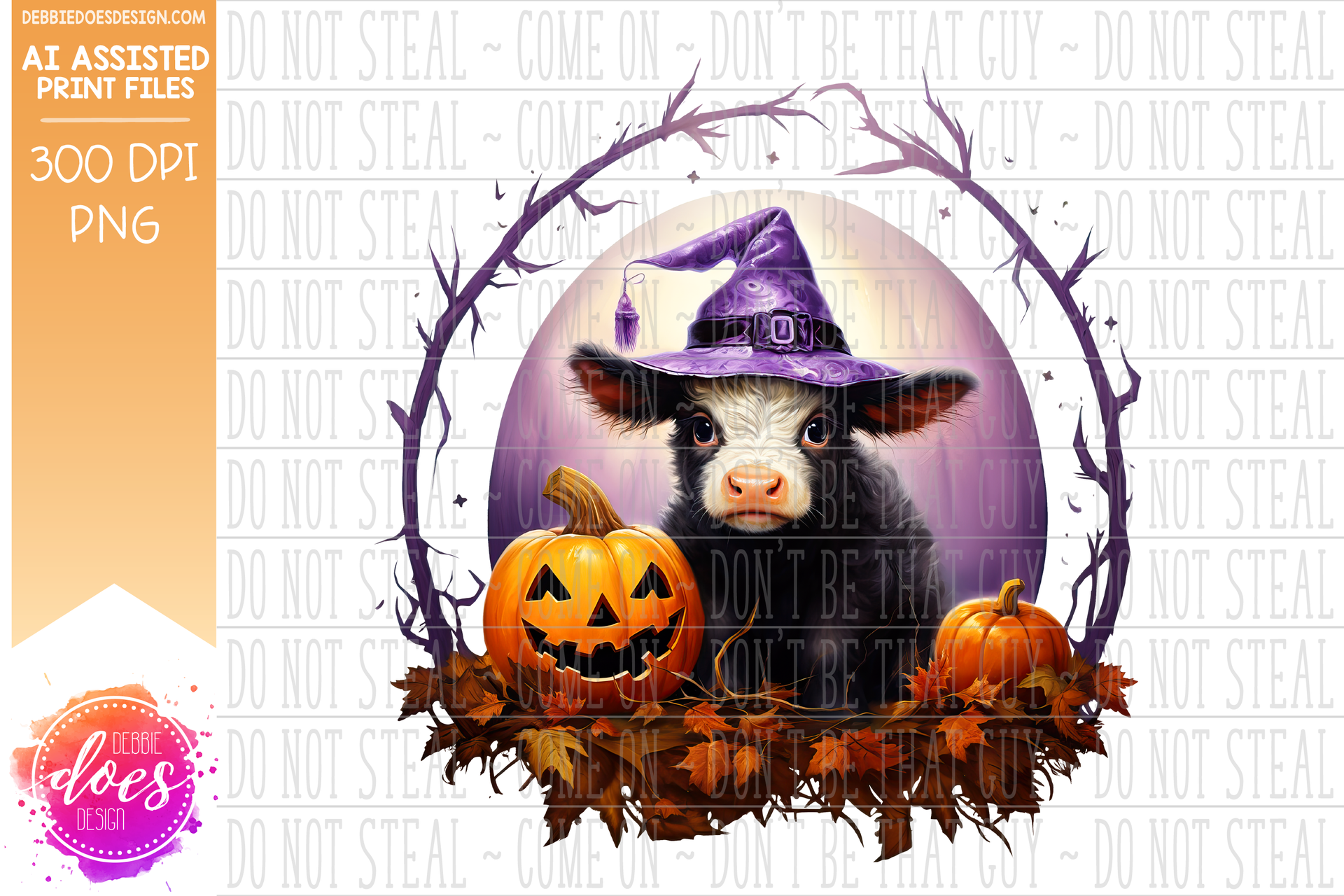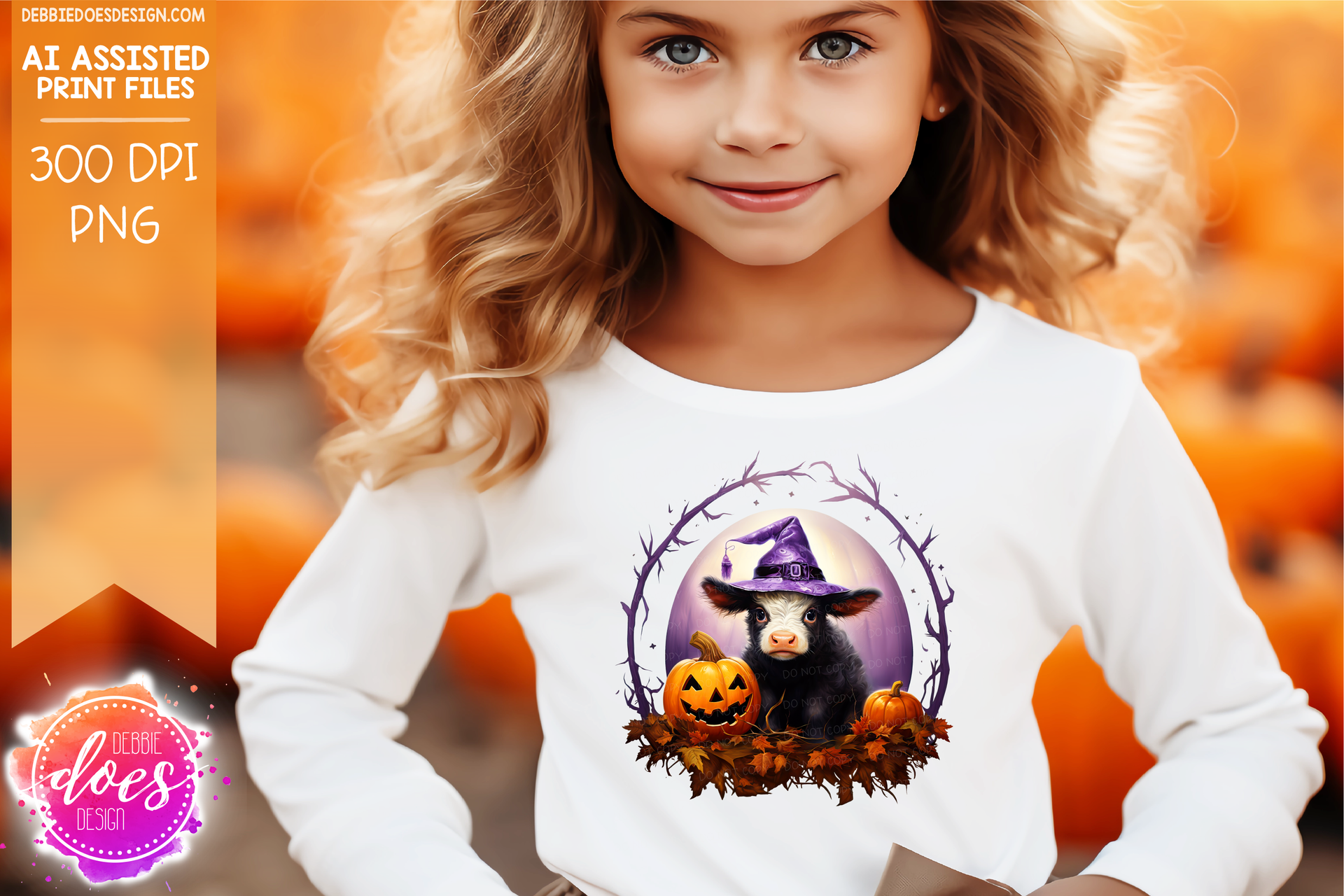 Baby Cow Witch with Pumpkins 1 - AI Assisted Printable/Sublimation Design
