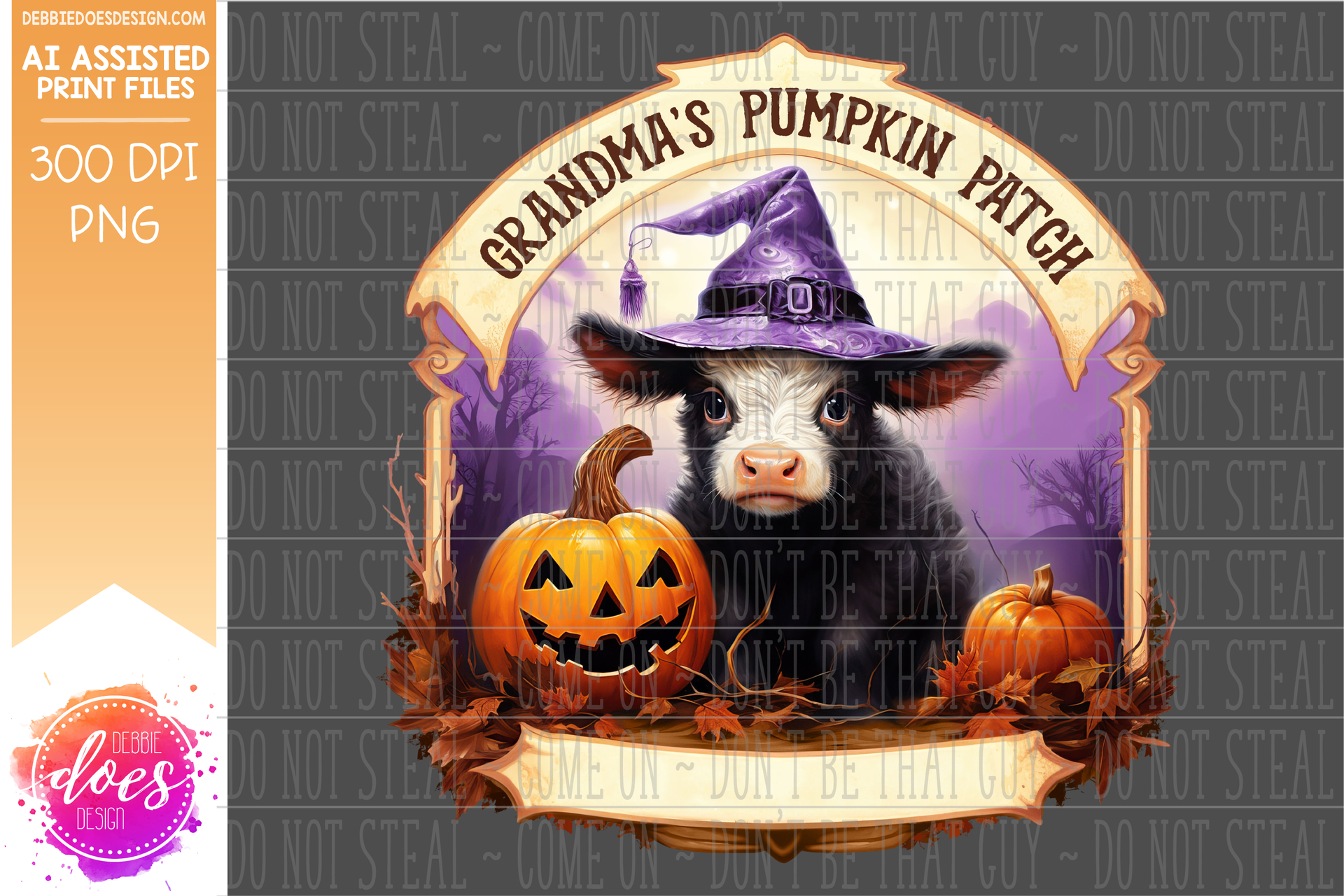 Baby Witch Cow with Banners - Grandmas Patch - Blank Banners - AI Assisted Printable/Sublimation Design