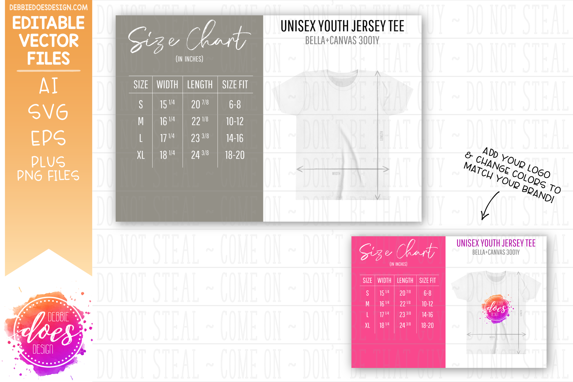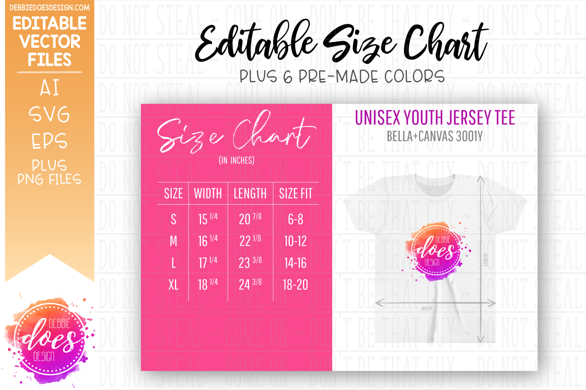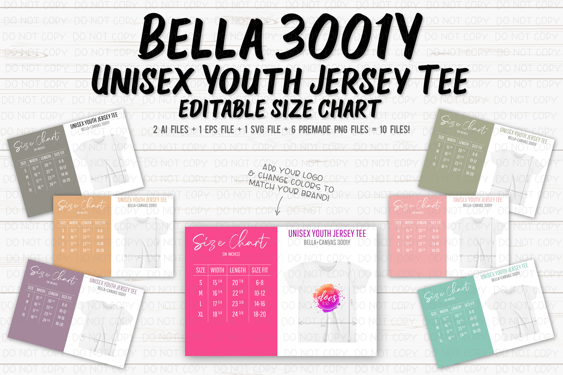 Bella+Canvas 3001Y Youth - Editable Size Chart + 6 Colored PNG Files