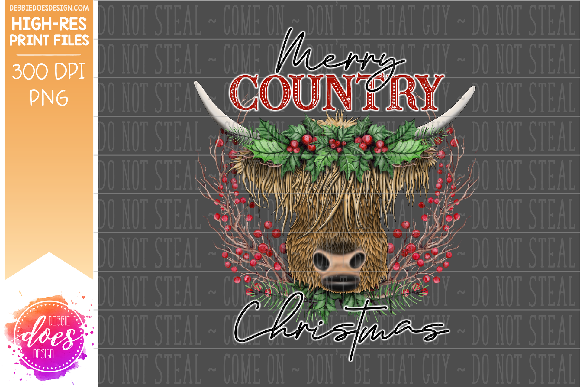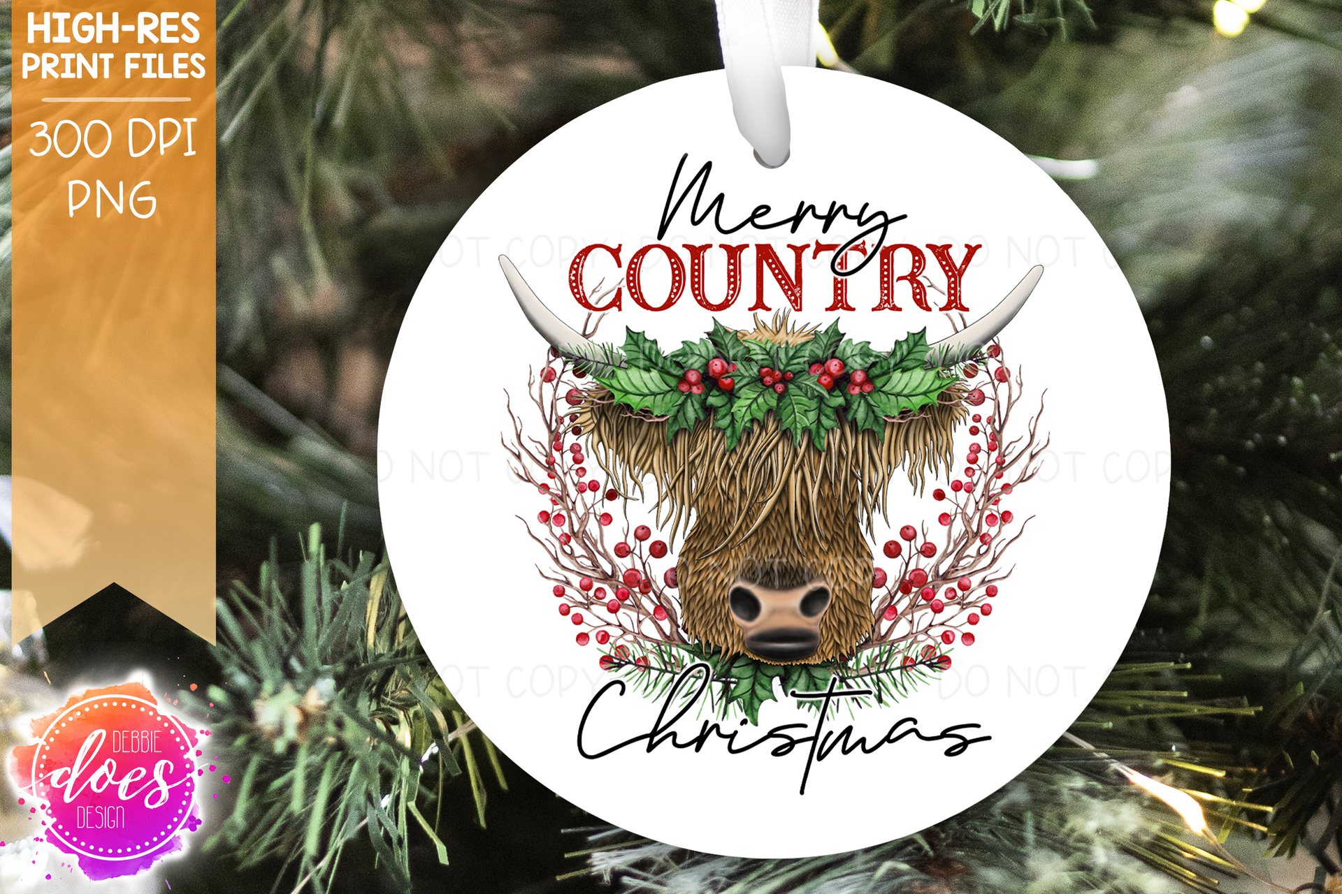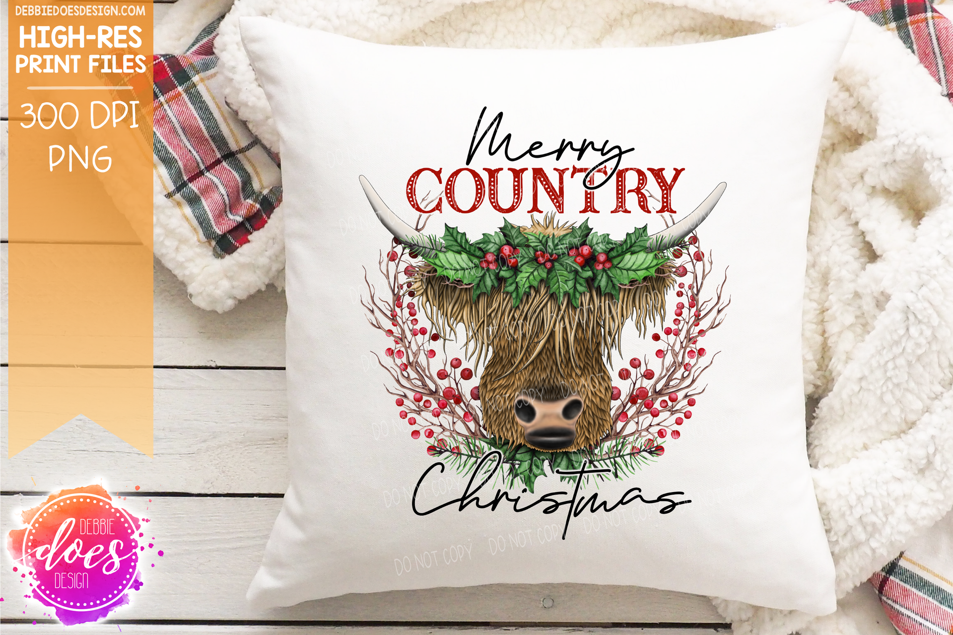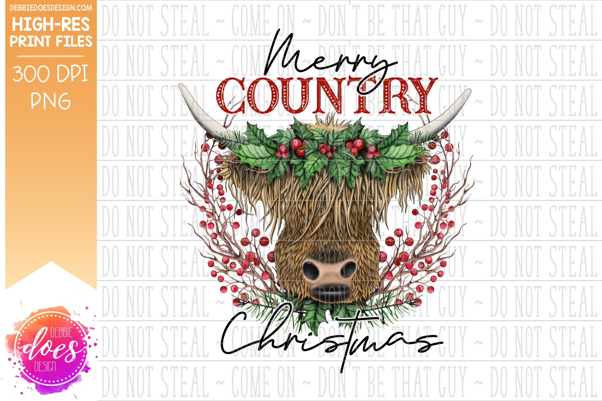 Merry Country Christmas - Script - Highland Cow - Sublimation/Printable Design