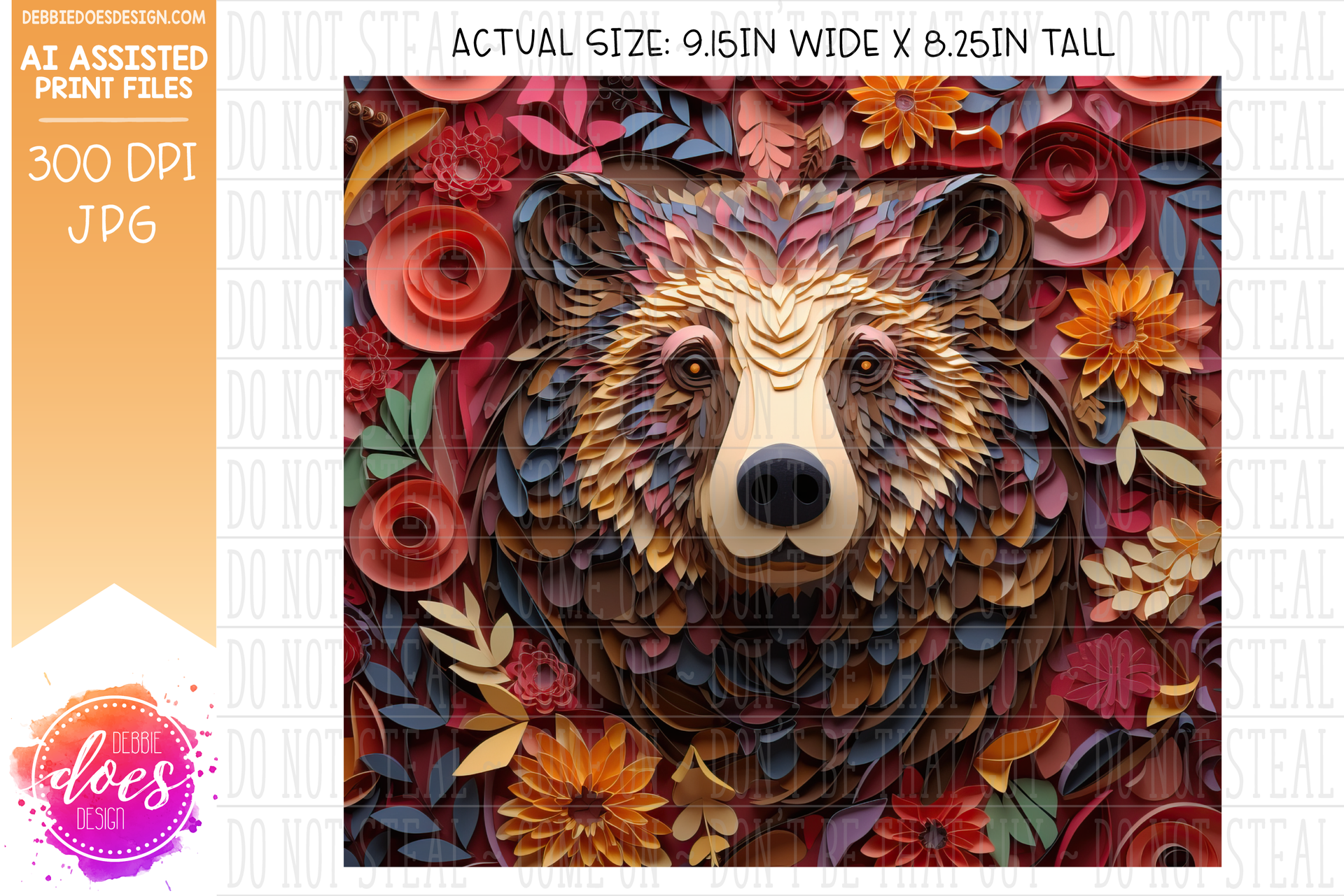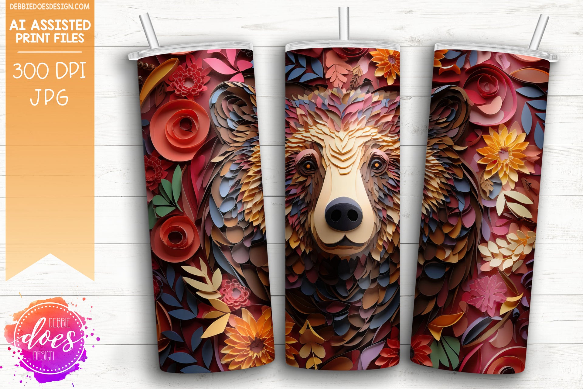 Paper Art - Brown Bear and Red Florals - Tumbler - Printable/Sublimation Design