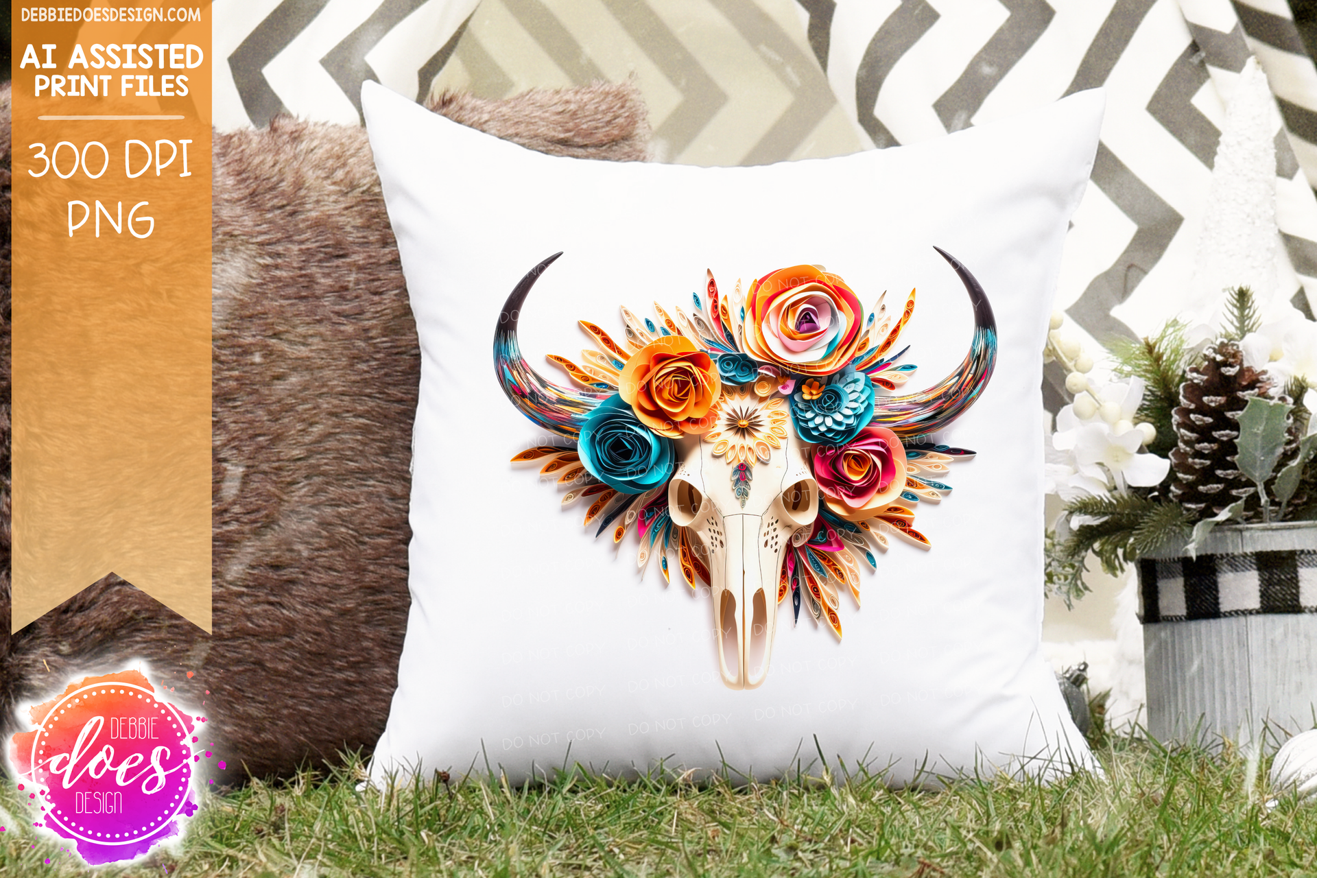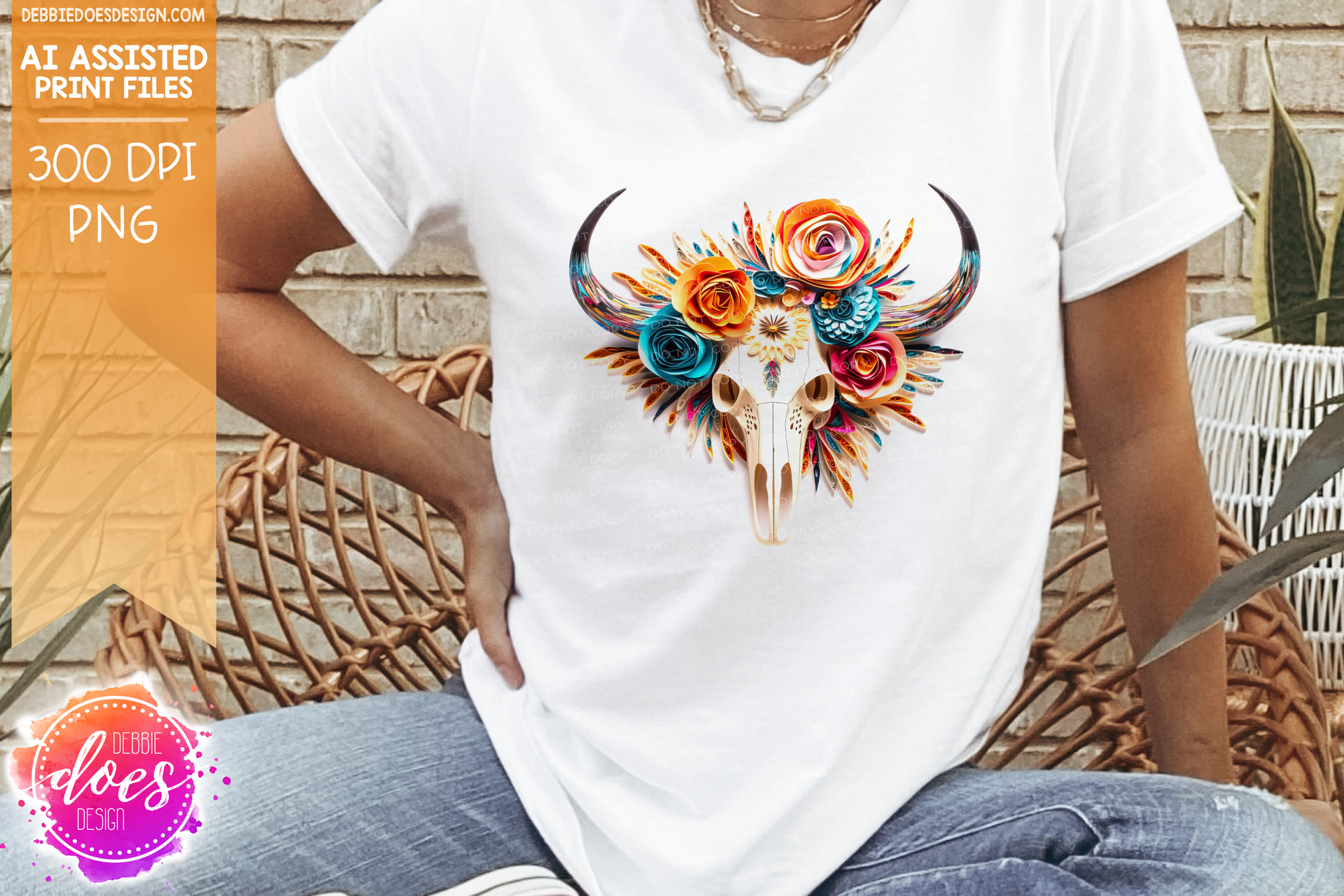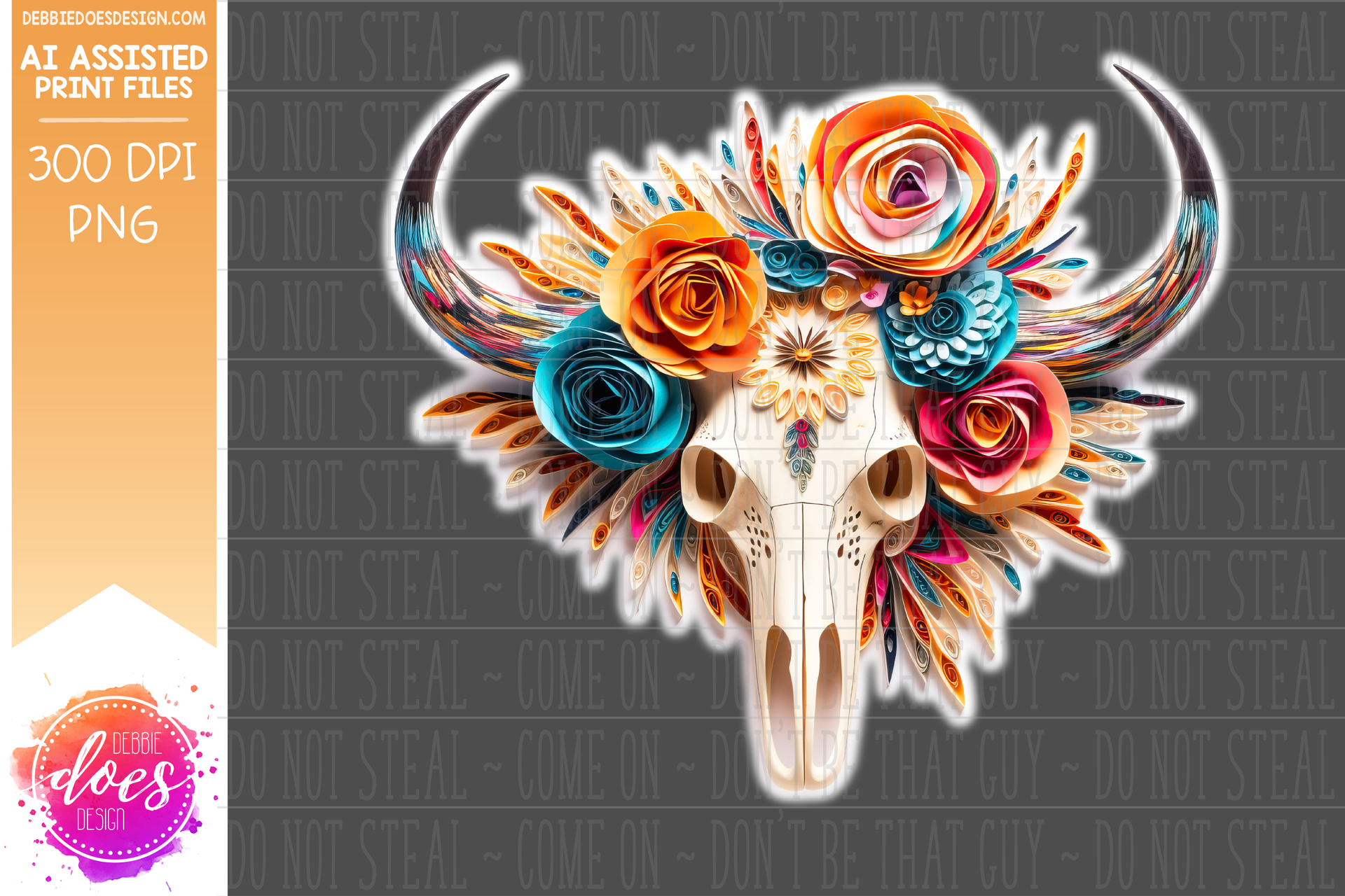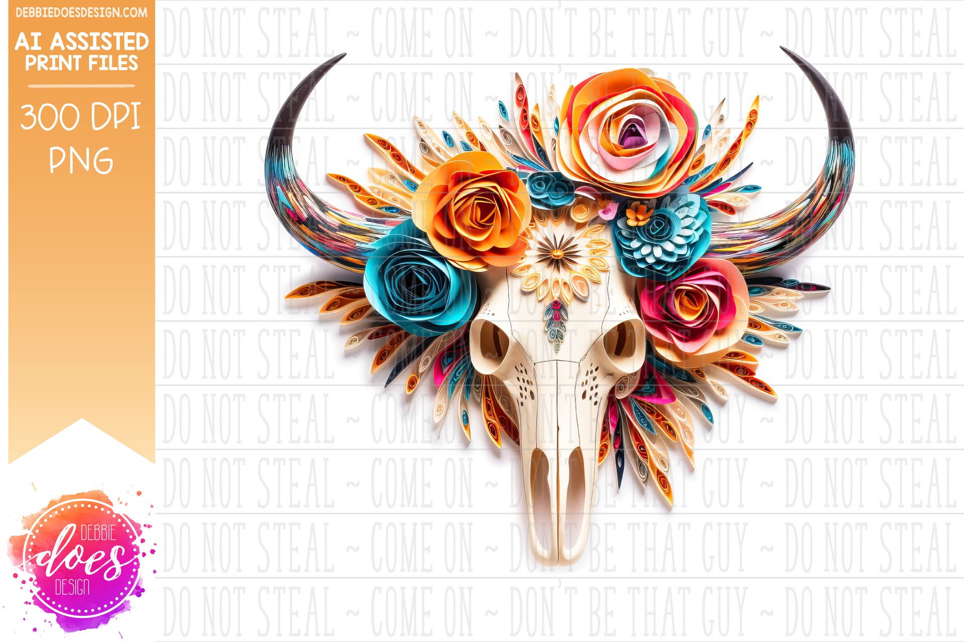 Paper Art - Cow Skull - Bold Blue Orange Pink 1 - White Glow - Printable/Sublimation Design