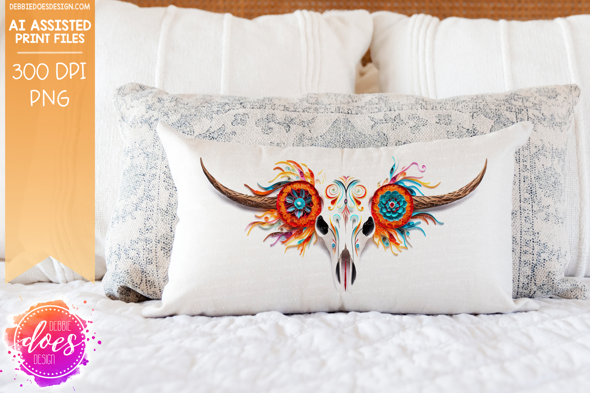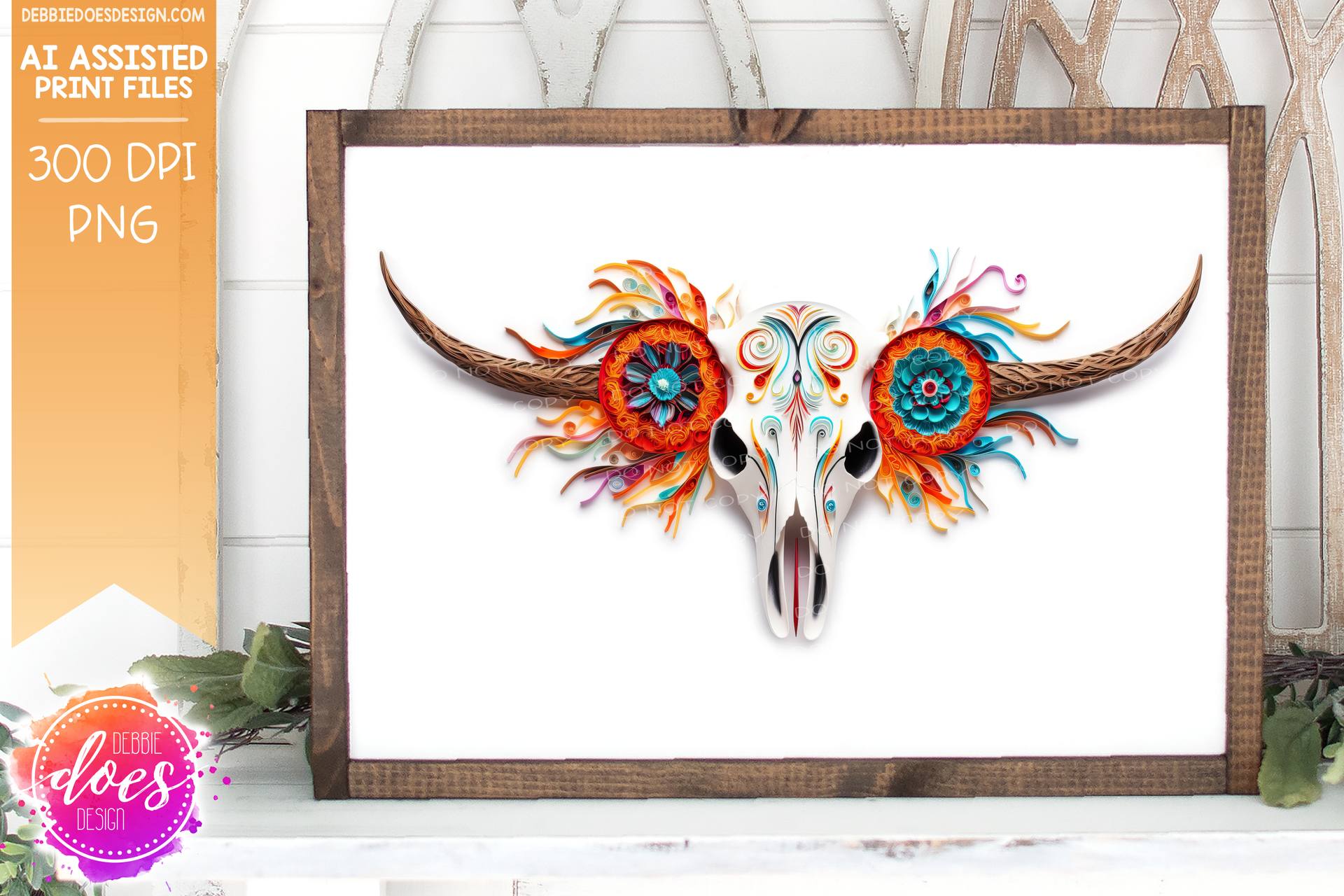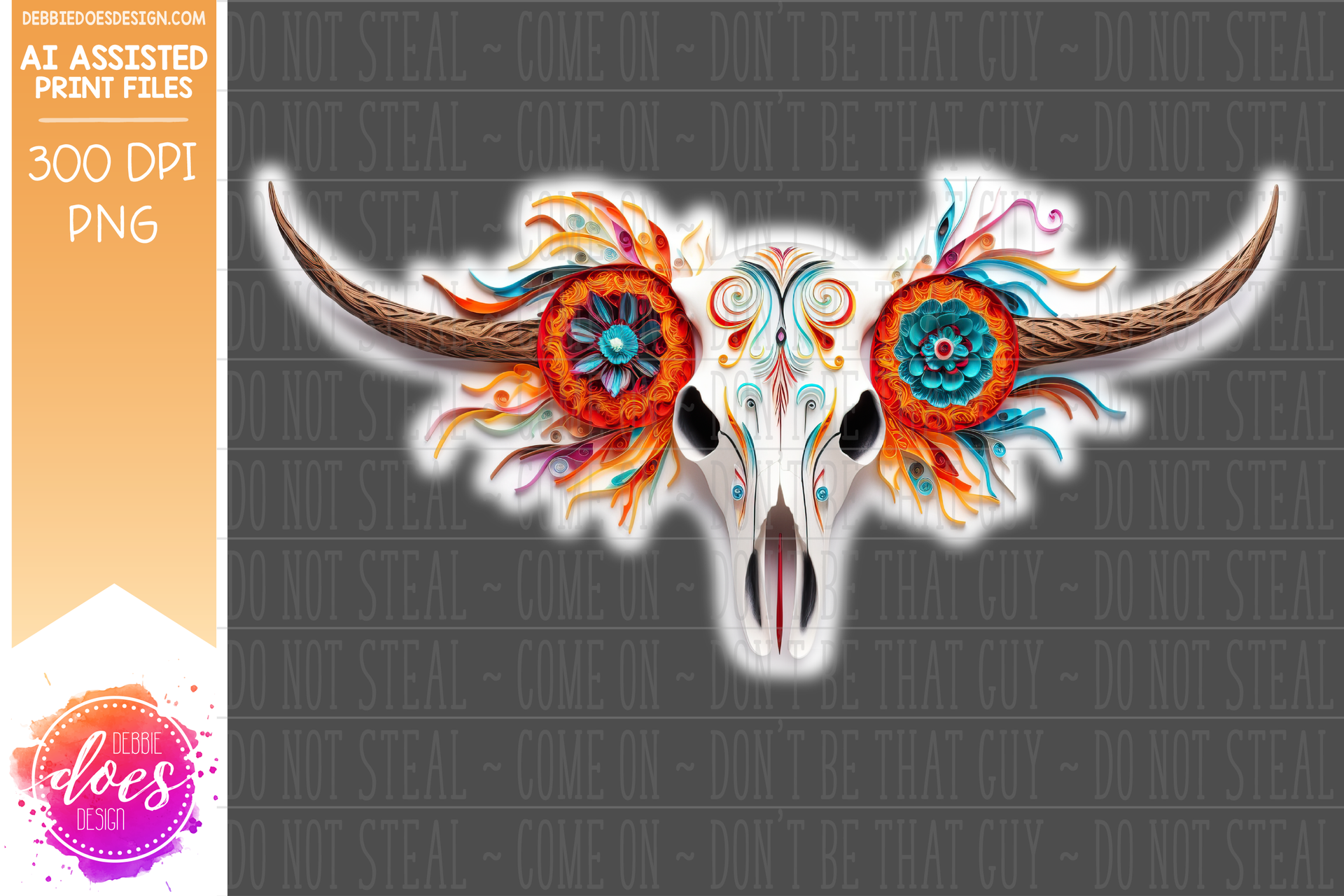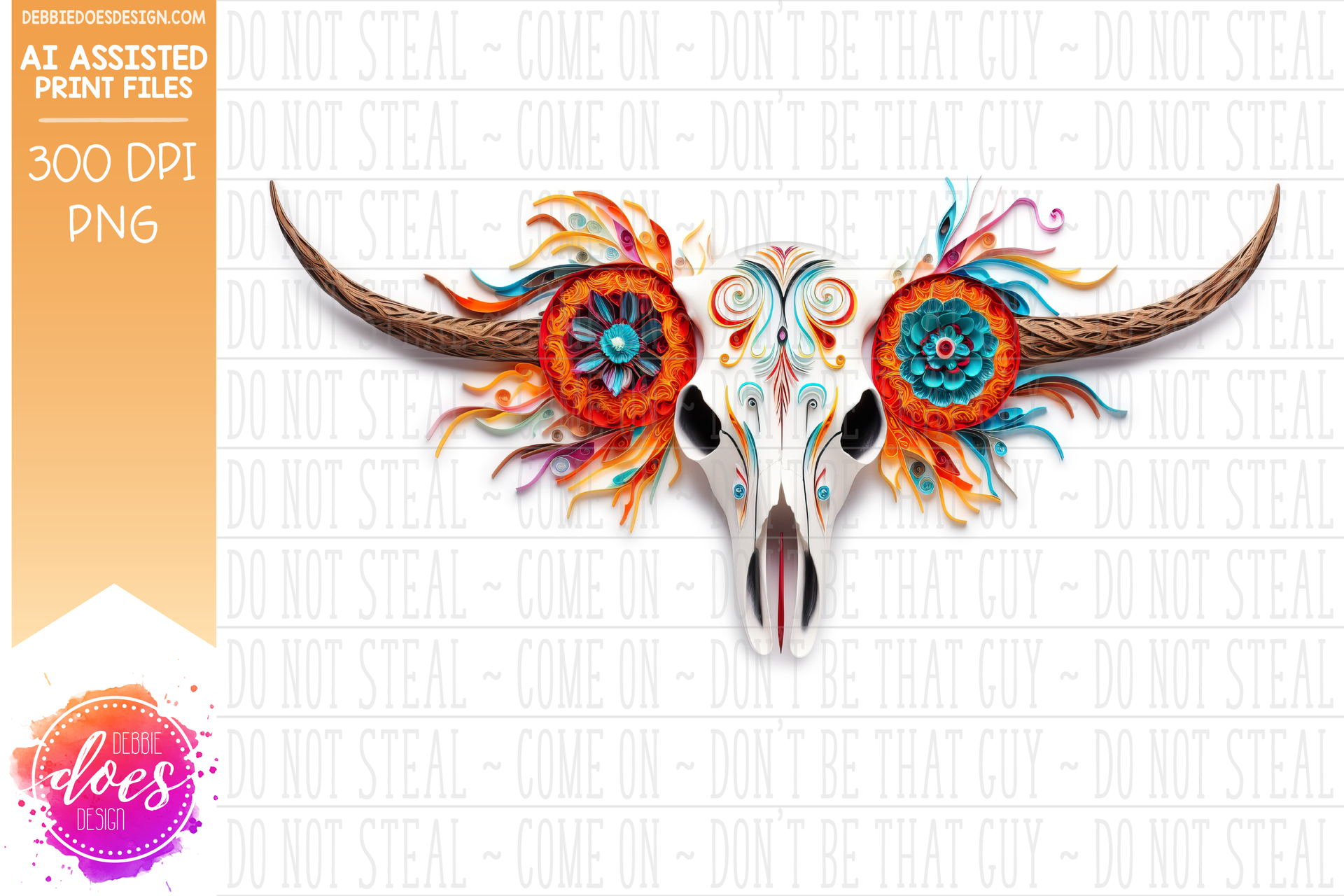 Paper Art - Cow Skull - Bold Blue Orange Red Longhorn 1 - White Glow - Printable/Sublimation Design