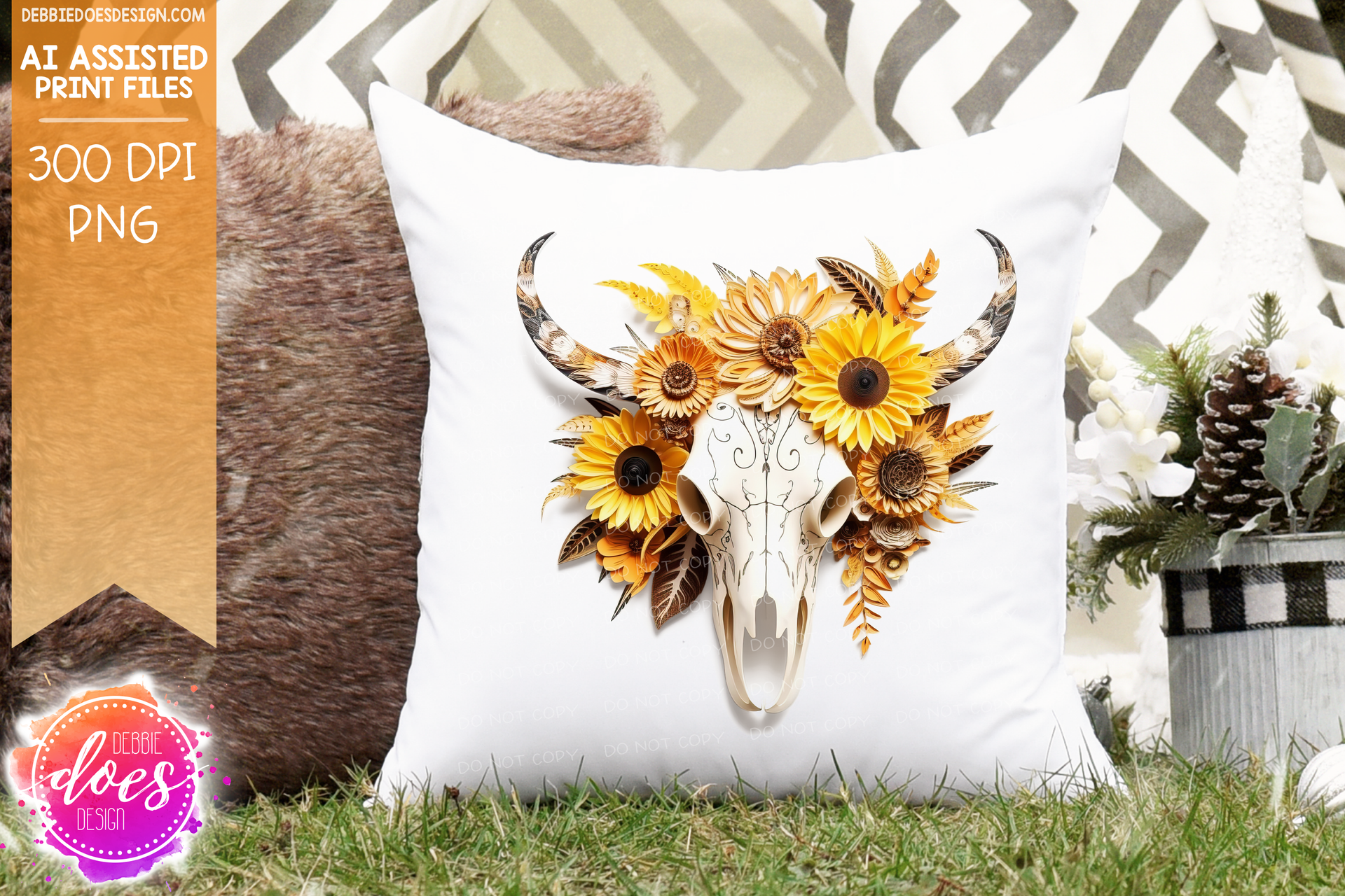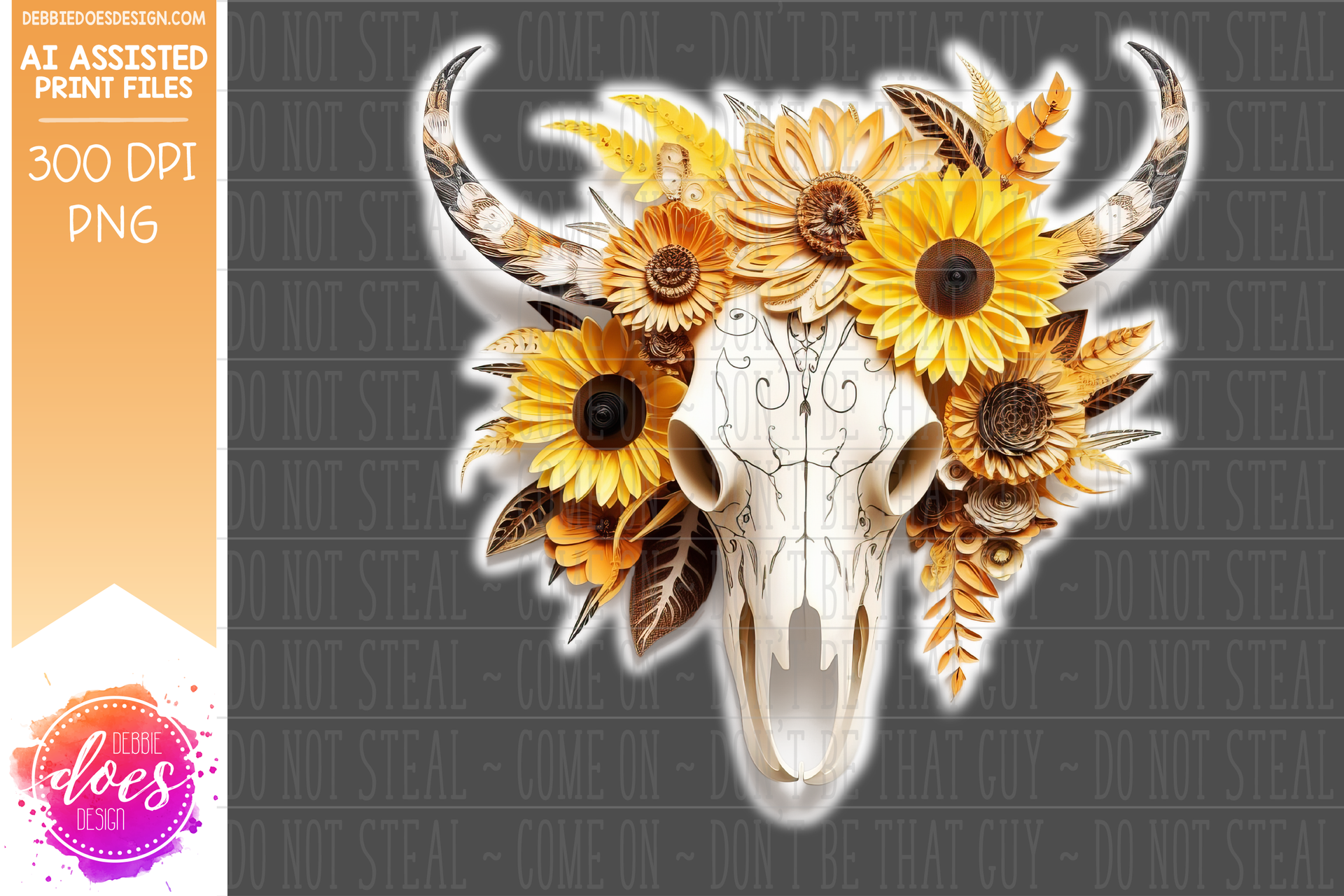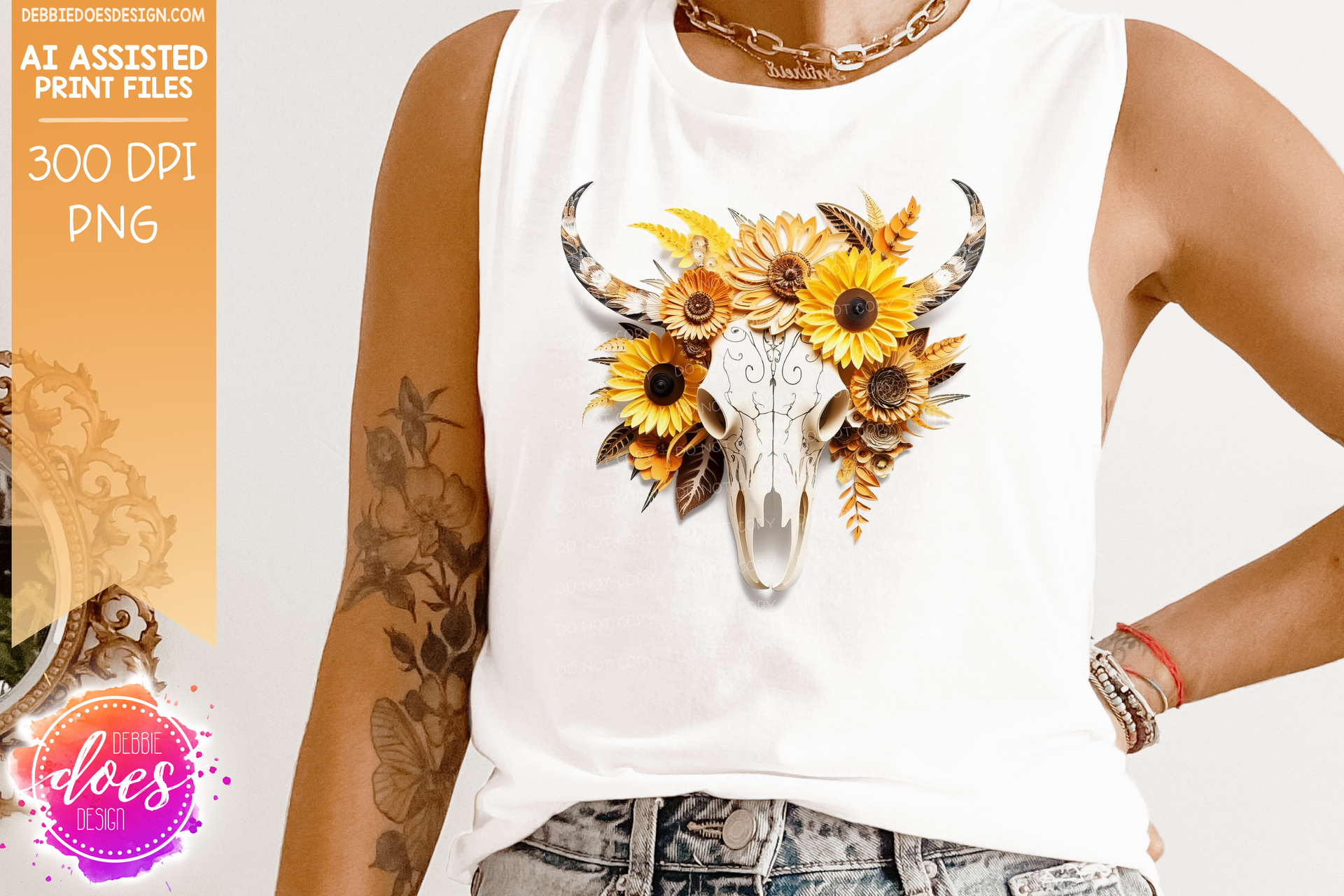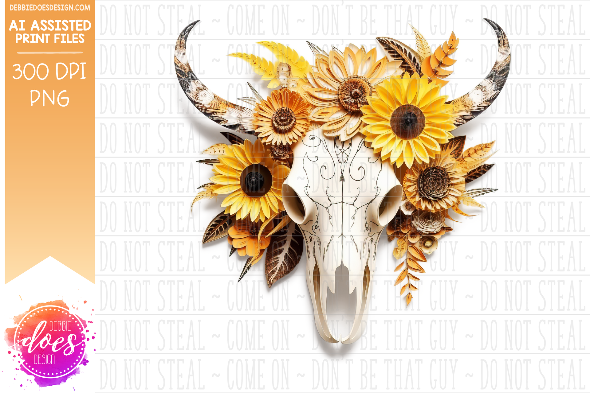 Paper Art - Cow Skull with Sunflowers 1 - White Glow - Printable/Sublimation Design