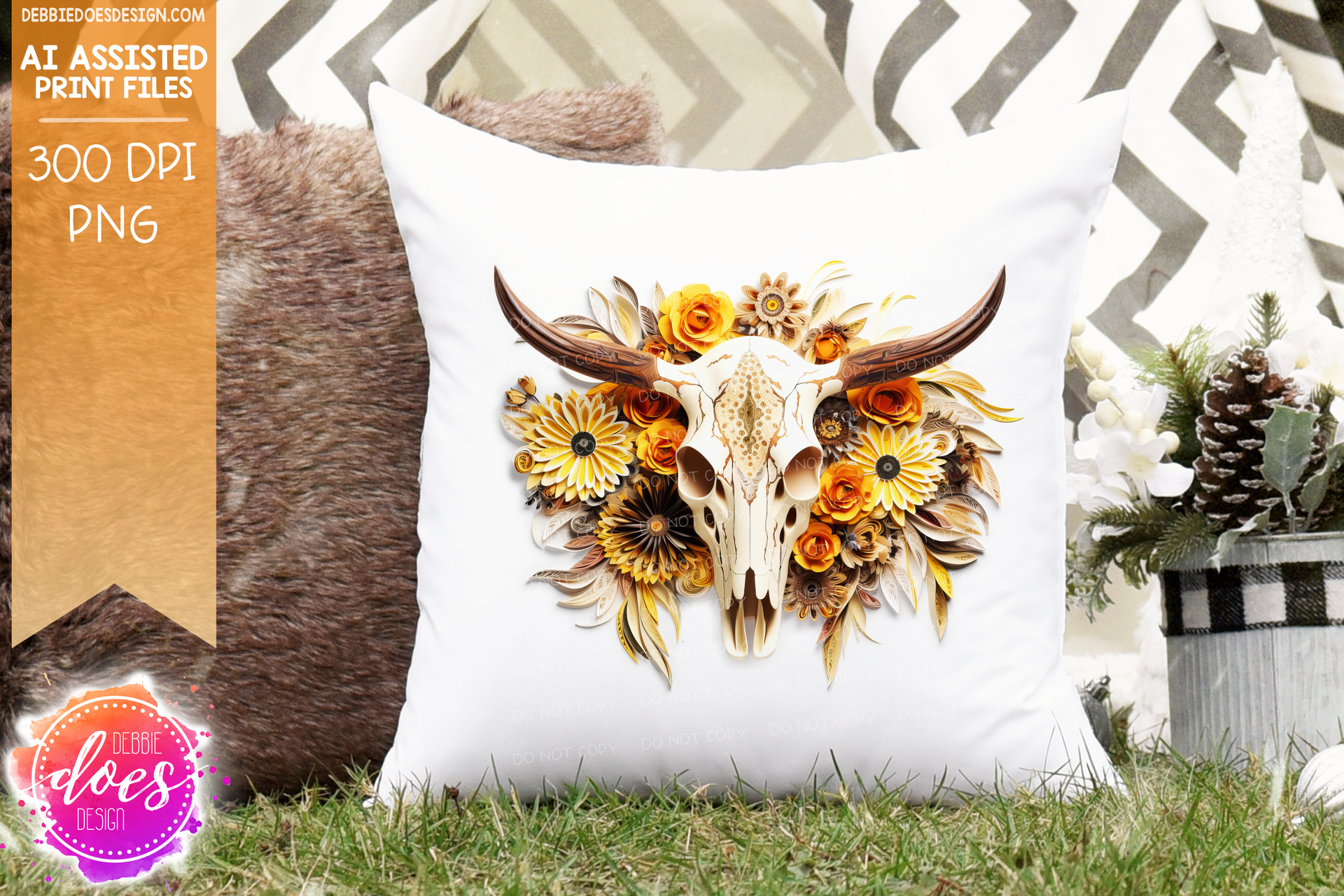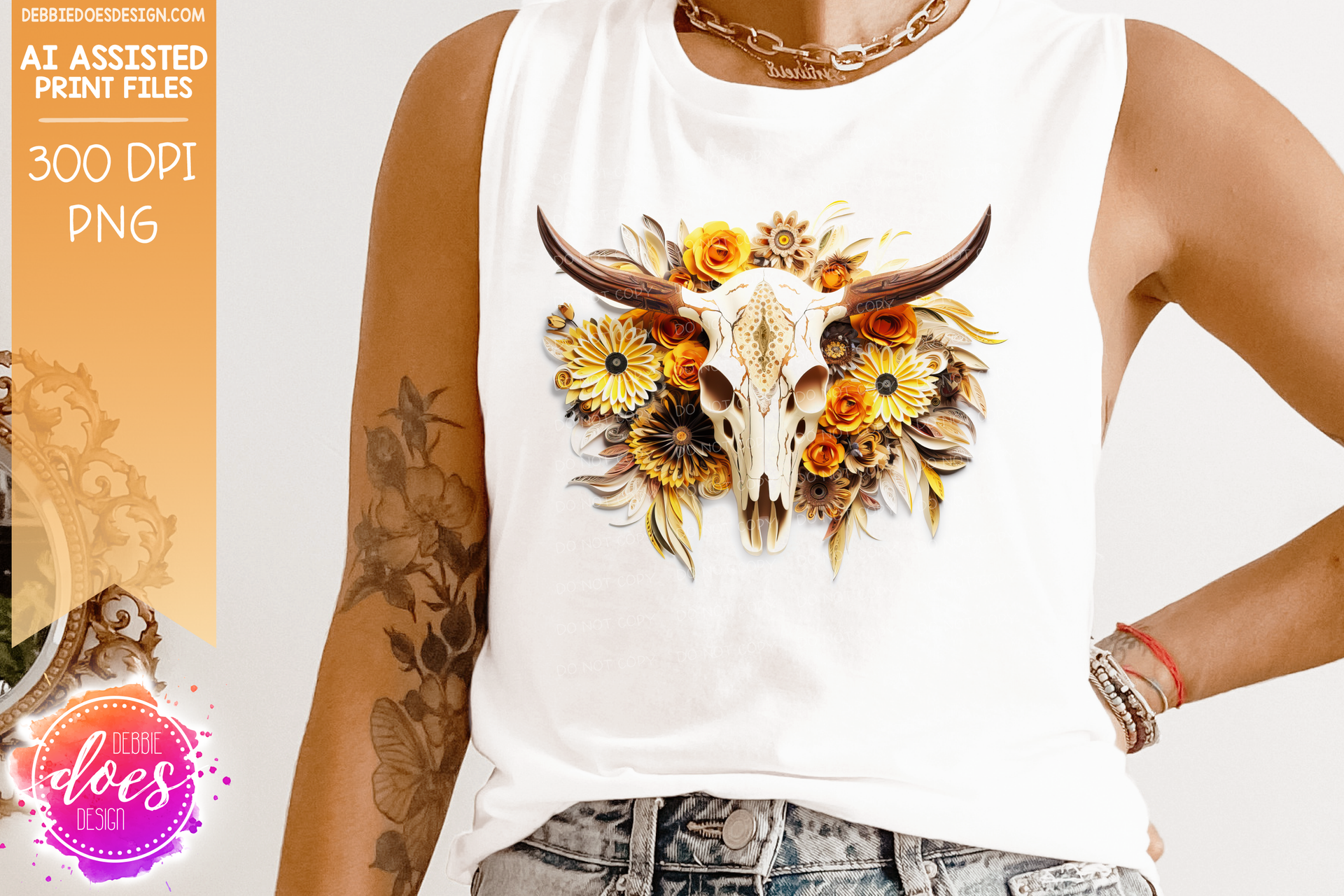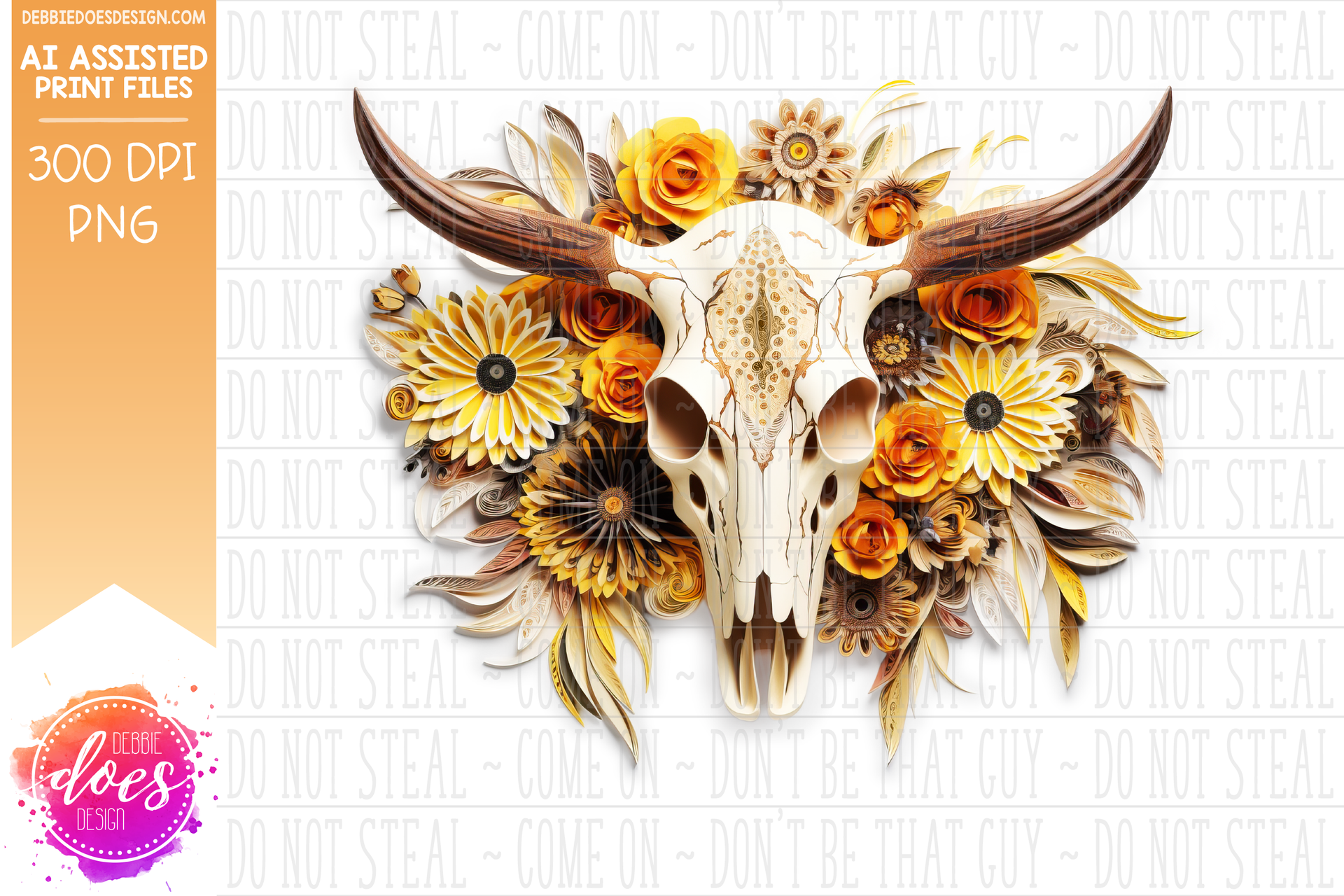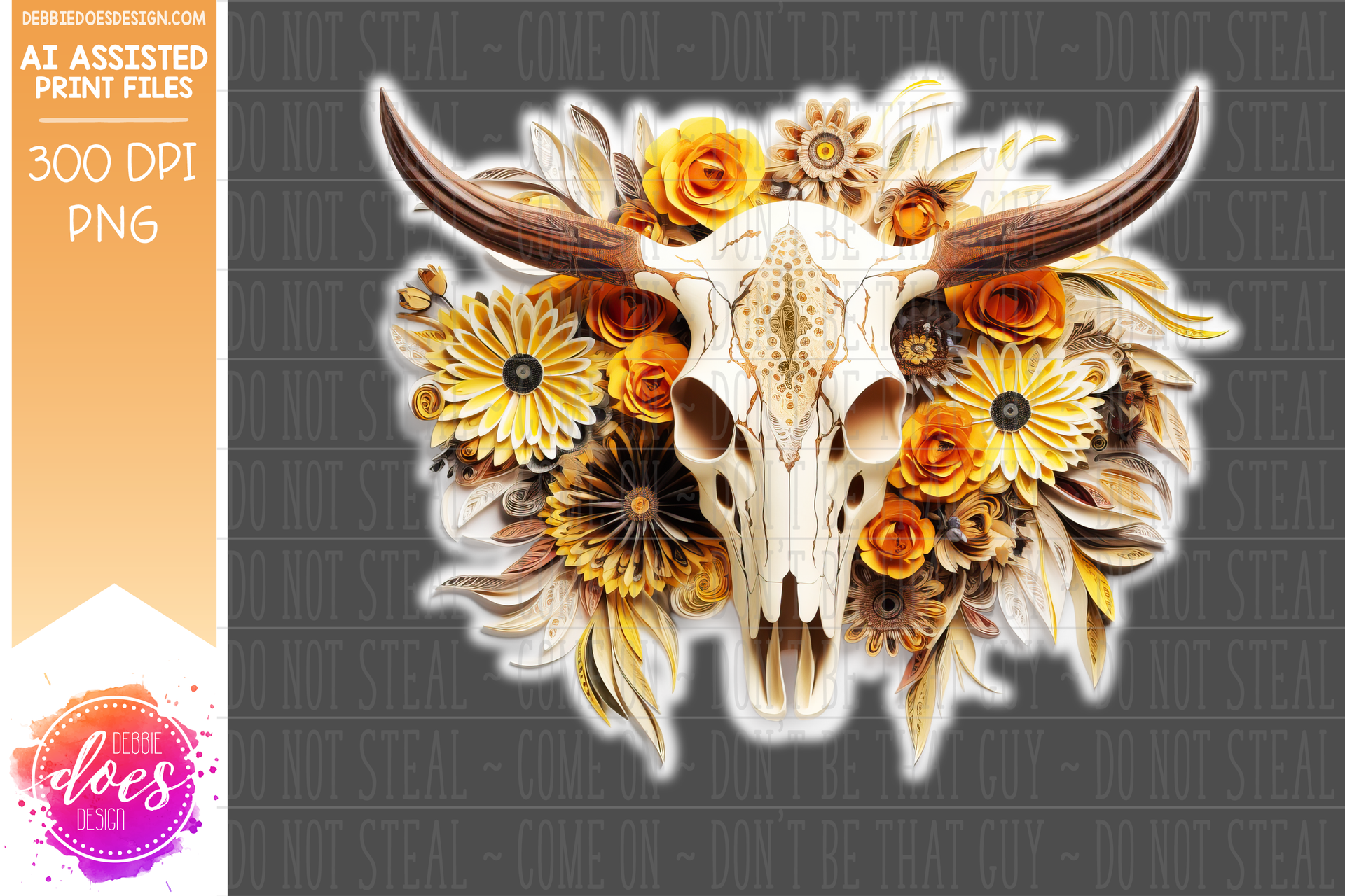 Paper Art - Cow Skull with Sunflowers 2 - White Glow - Printable/Sublimation Design