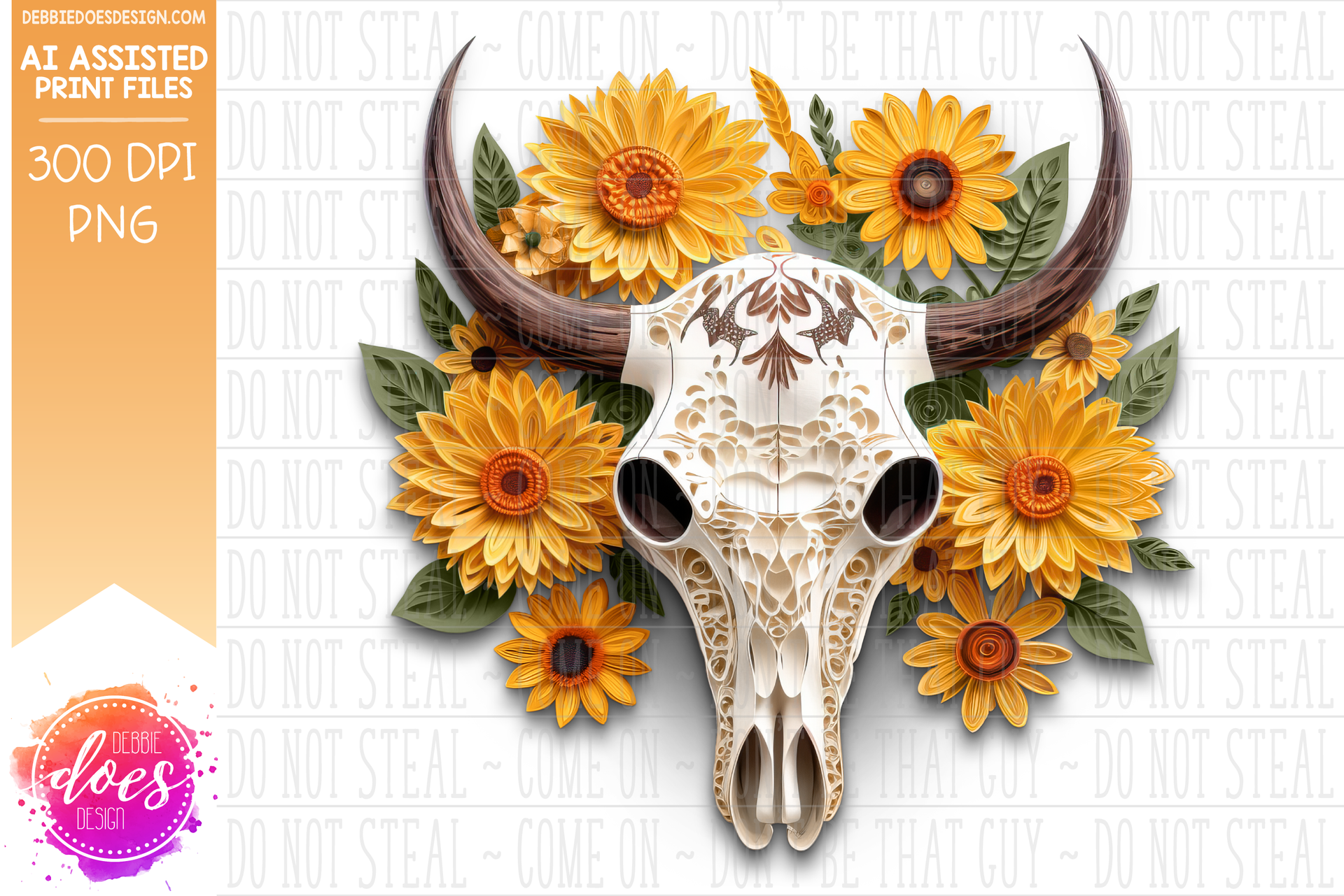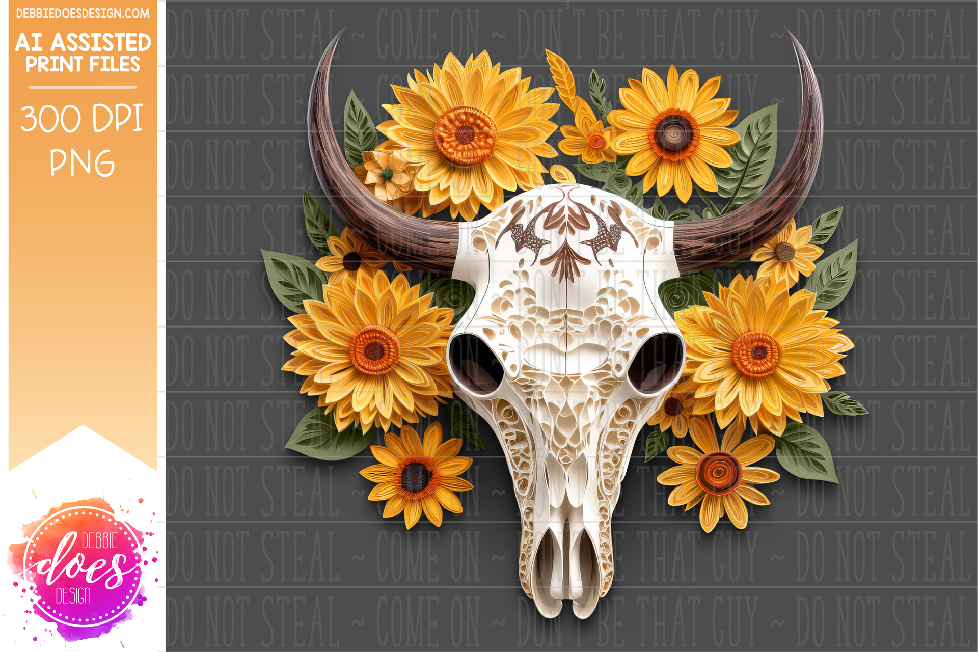Paper Art - Cow Skull with Sunflowers - Olive - Printable/Sublimation Design