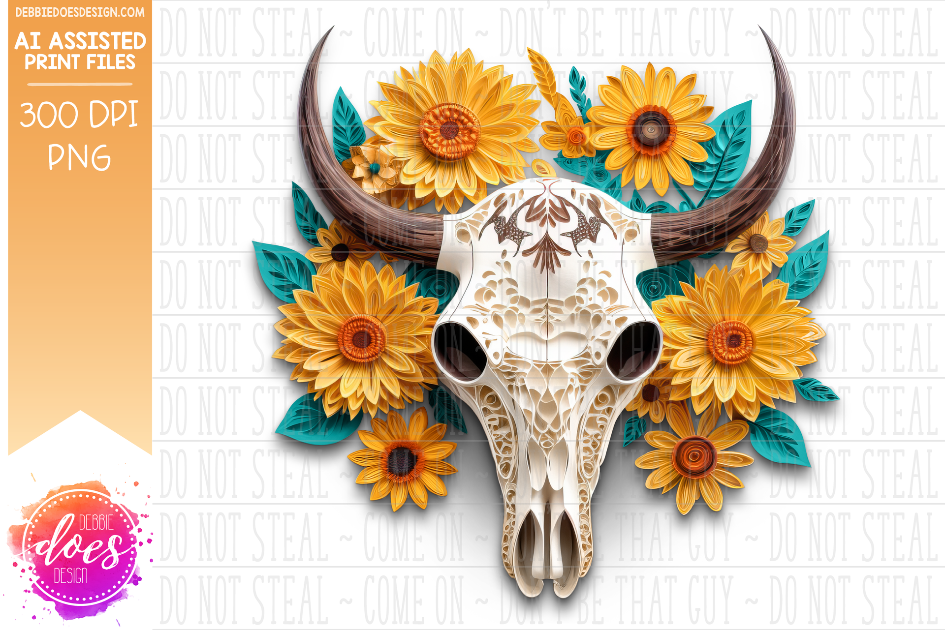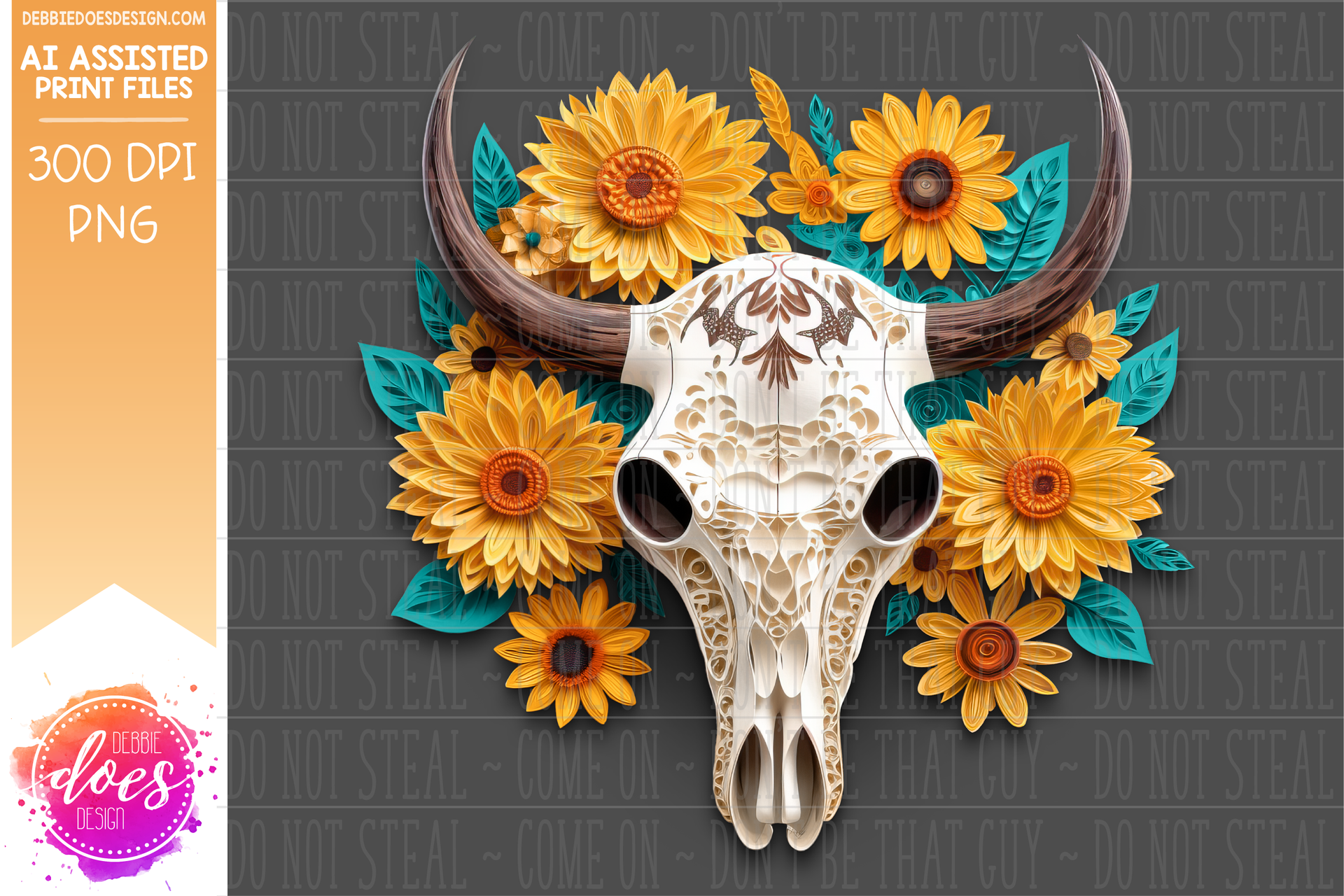 Paper Art - Cow Skull with Sunflowers - Teal - Printable/Sublimation Design