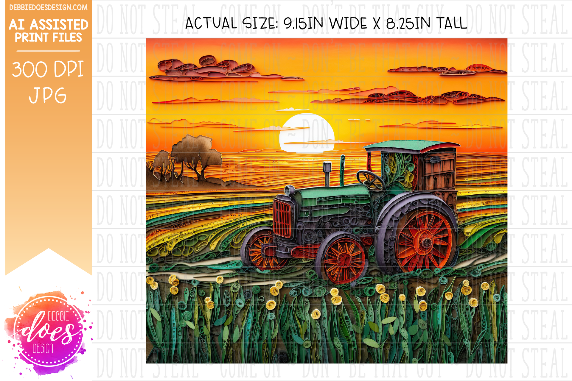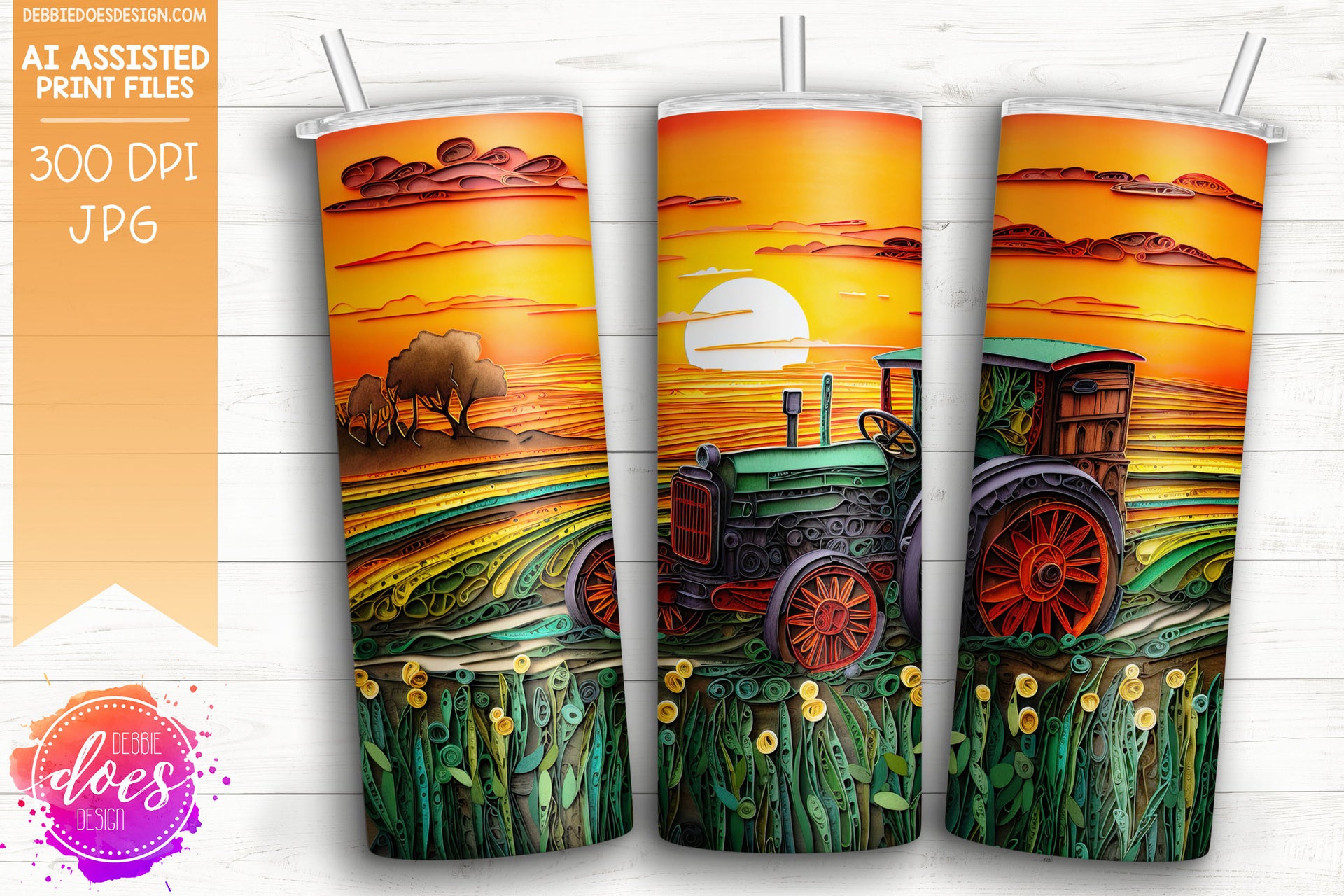 Paper Art - Green Tractor at Sunset 1 - Tumbler - Printable/Sublimation Design
