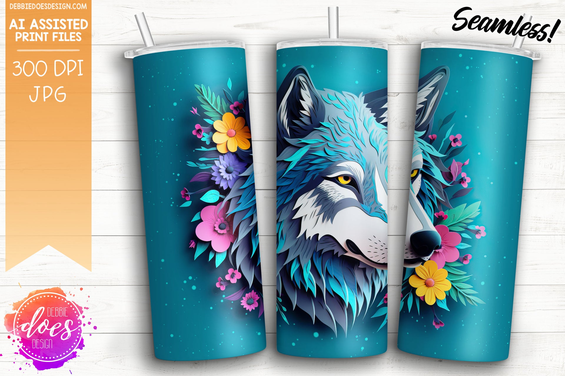 Paper Art - Wolf on Blue with Flowers - Tumbler - Printable/Sublimation Design