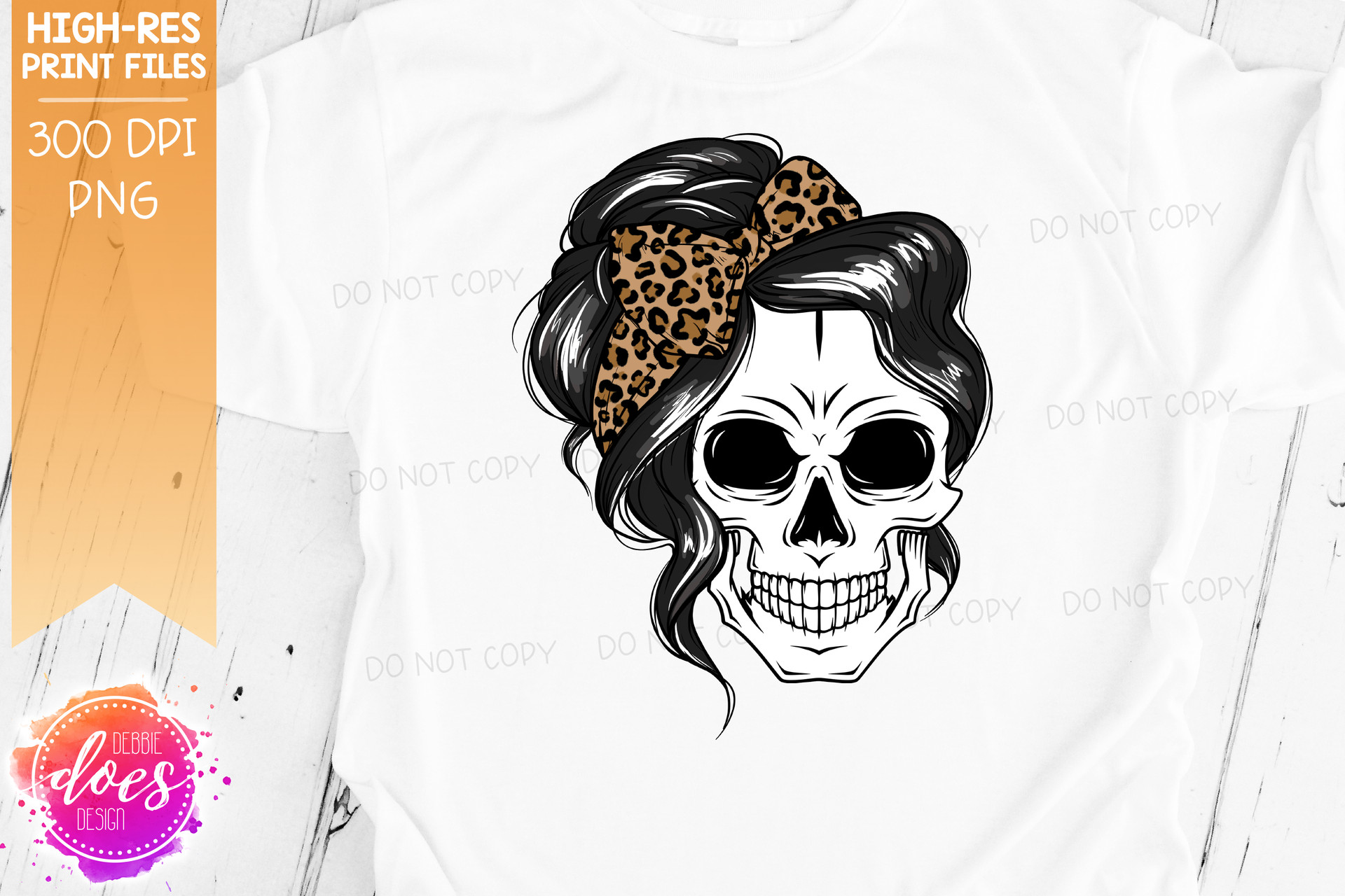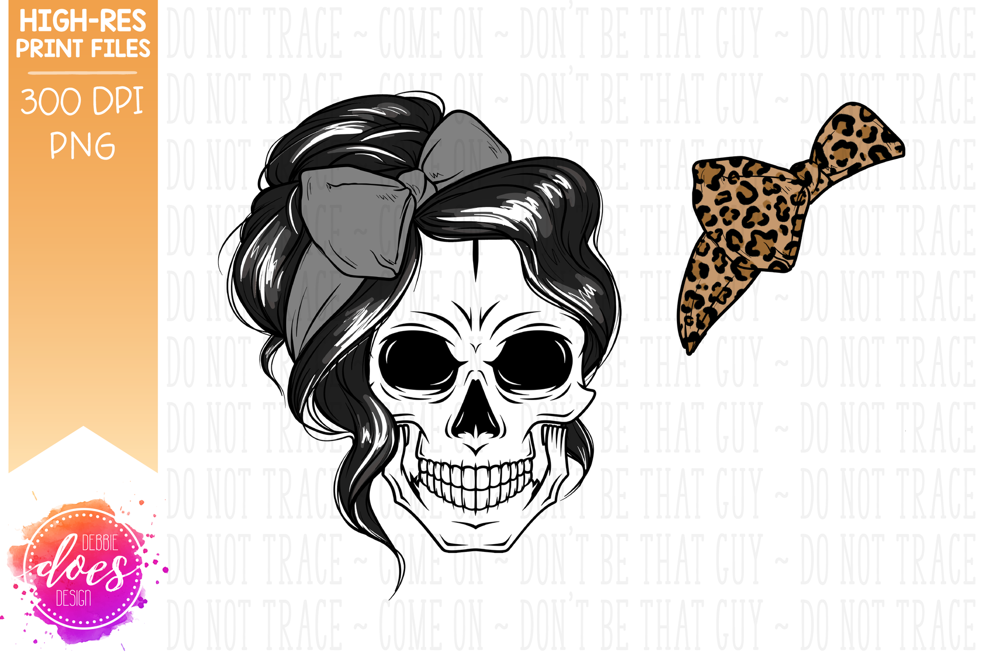 The Messy Bun Skull - Black - With Leopard Bow - Sublimation/Printable Design
