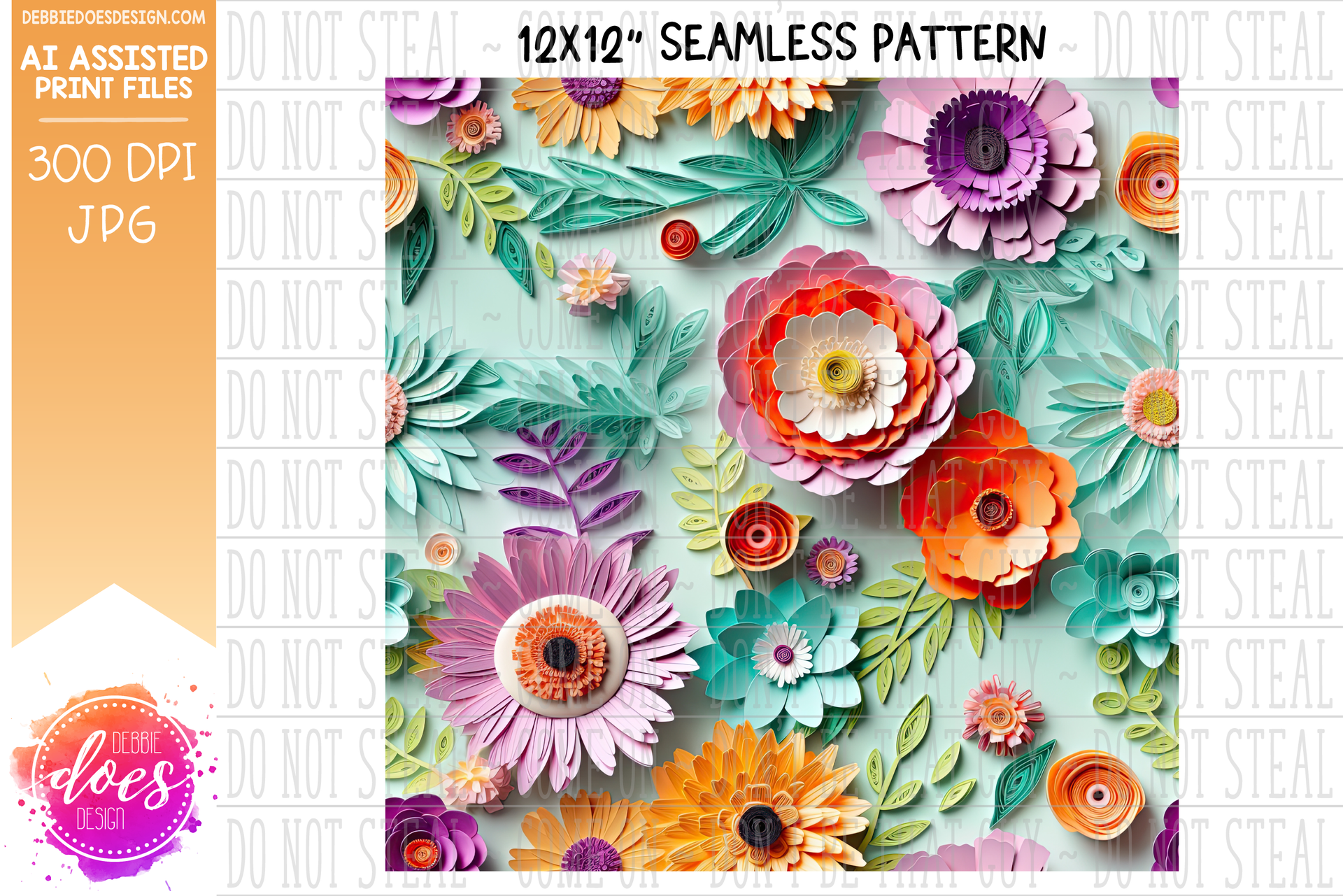 Paper Flowers - Coral Teal Purple - Seamless Pattern 1- Design Elements