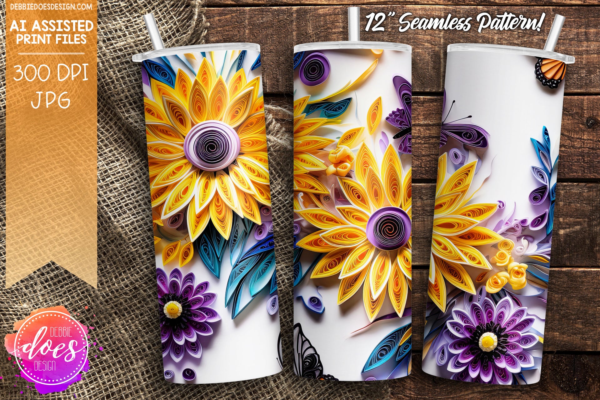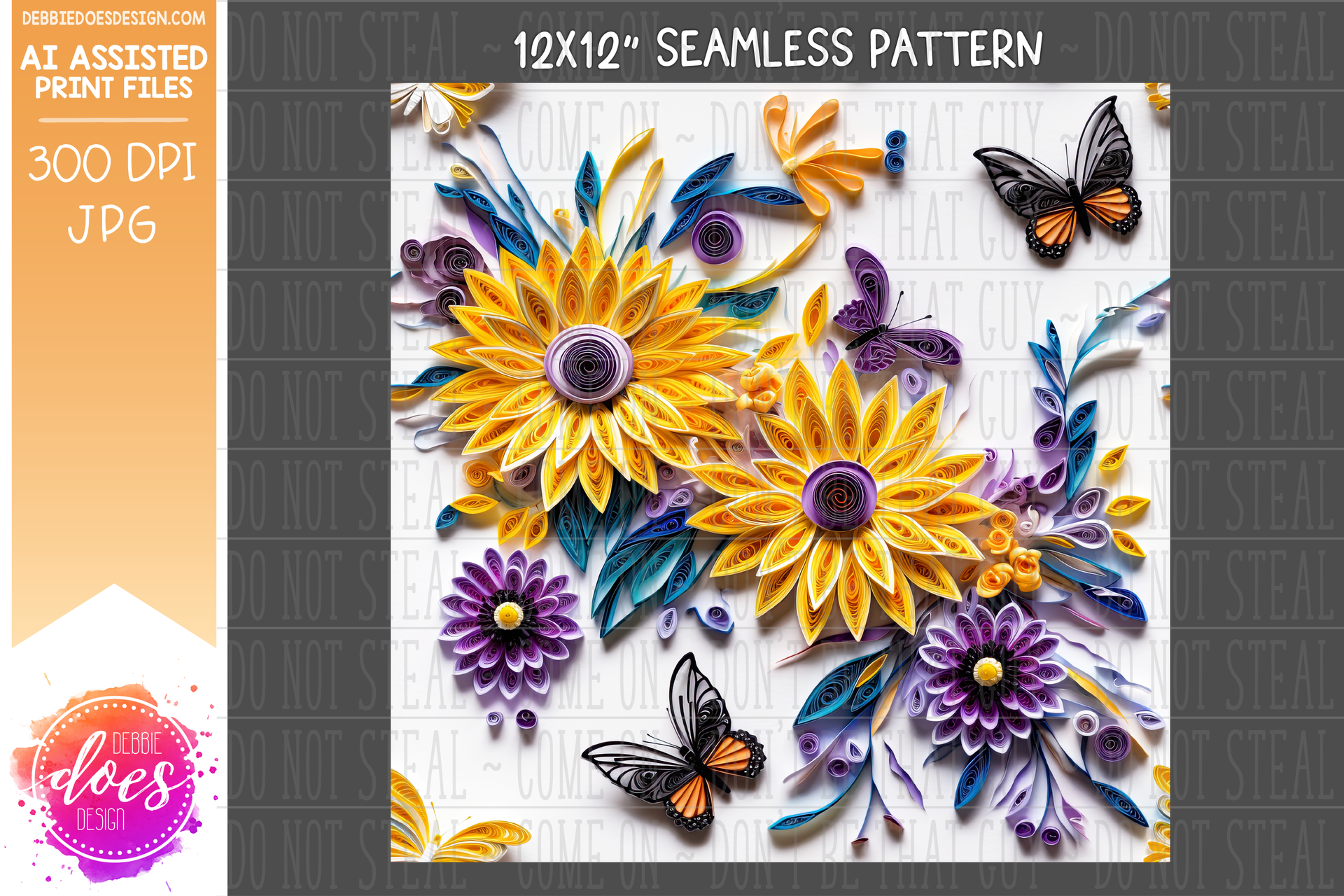 Paper Quilling - Sunflowers and Butterflies Blue Purple - Seamless Pattern - Design Elements