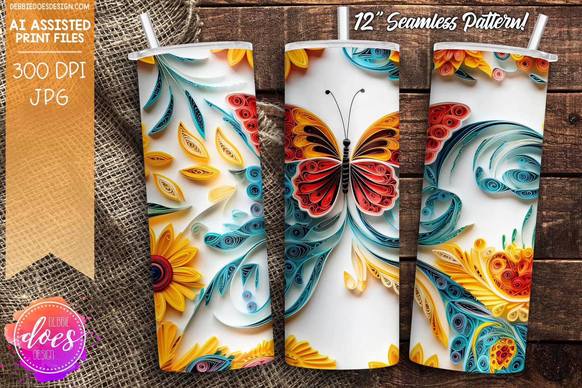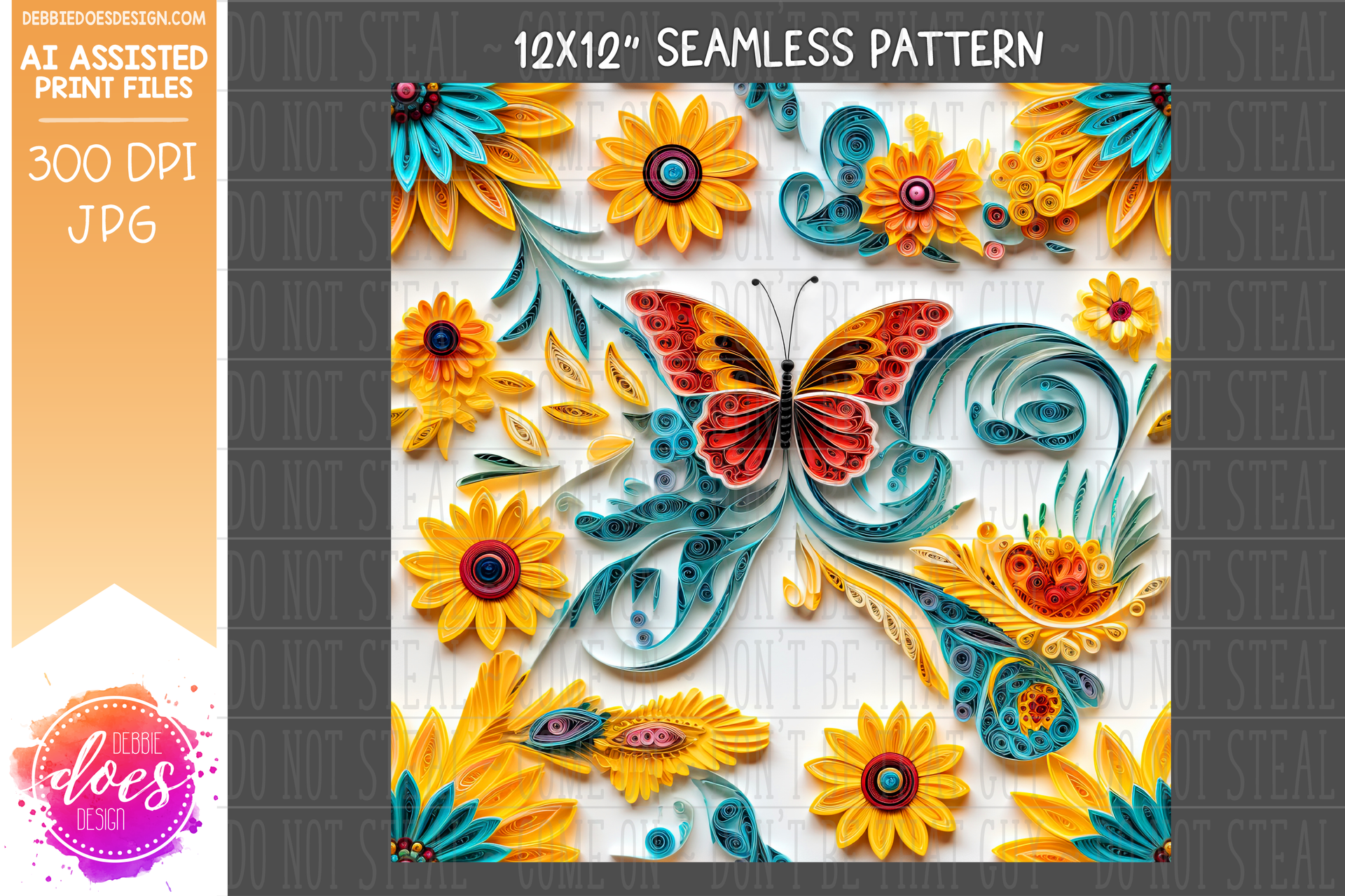 Paper Quilling - Sunflowers and Butterflies Teal Red - Seamless Pattern - Design Elements