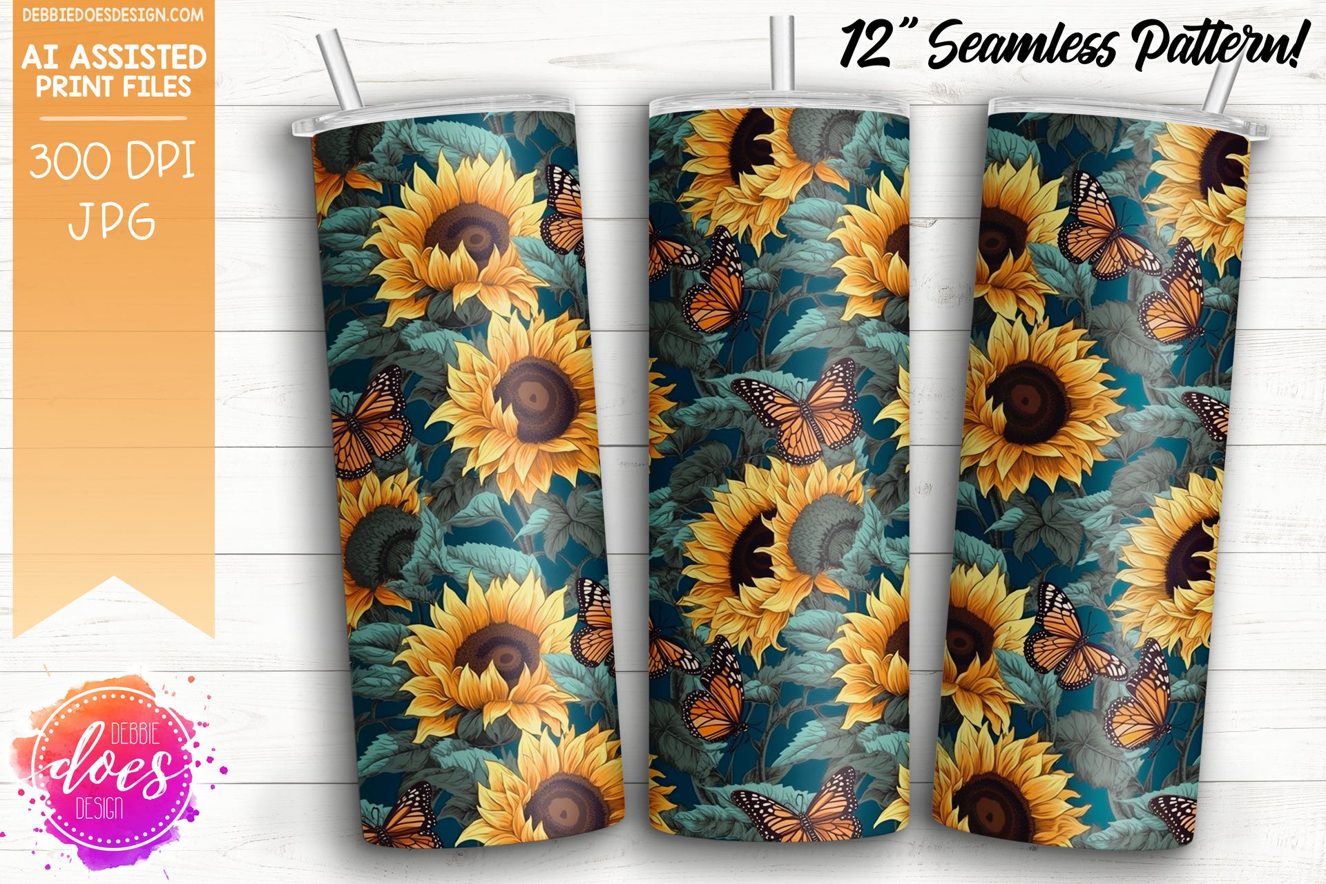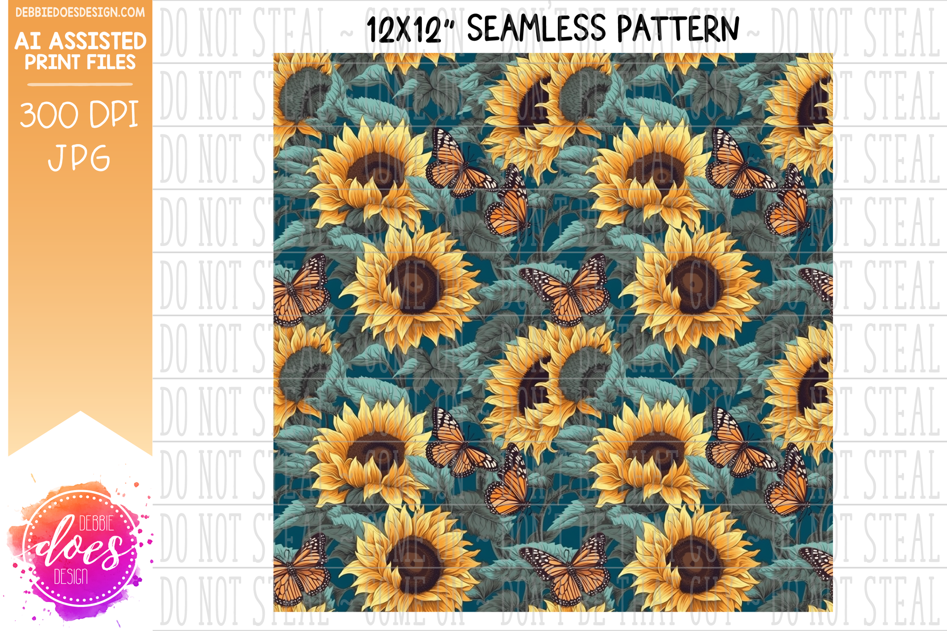 Vintage Flowers Seamless Pattern - Sunflowers and Butterflies Teal - Design Elements