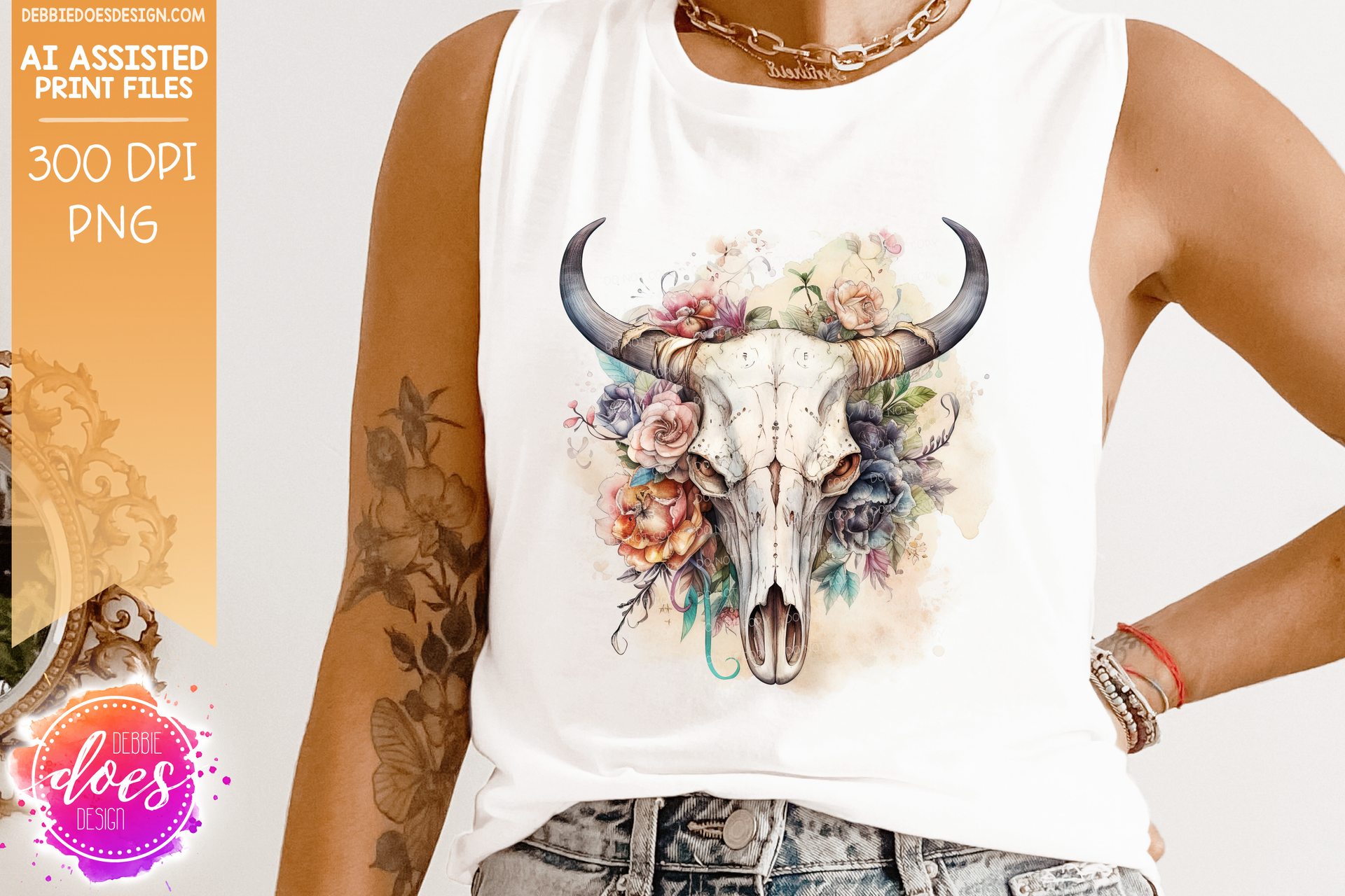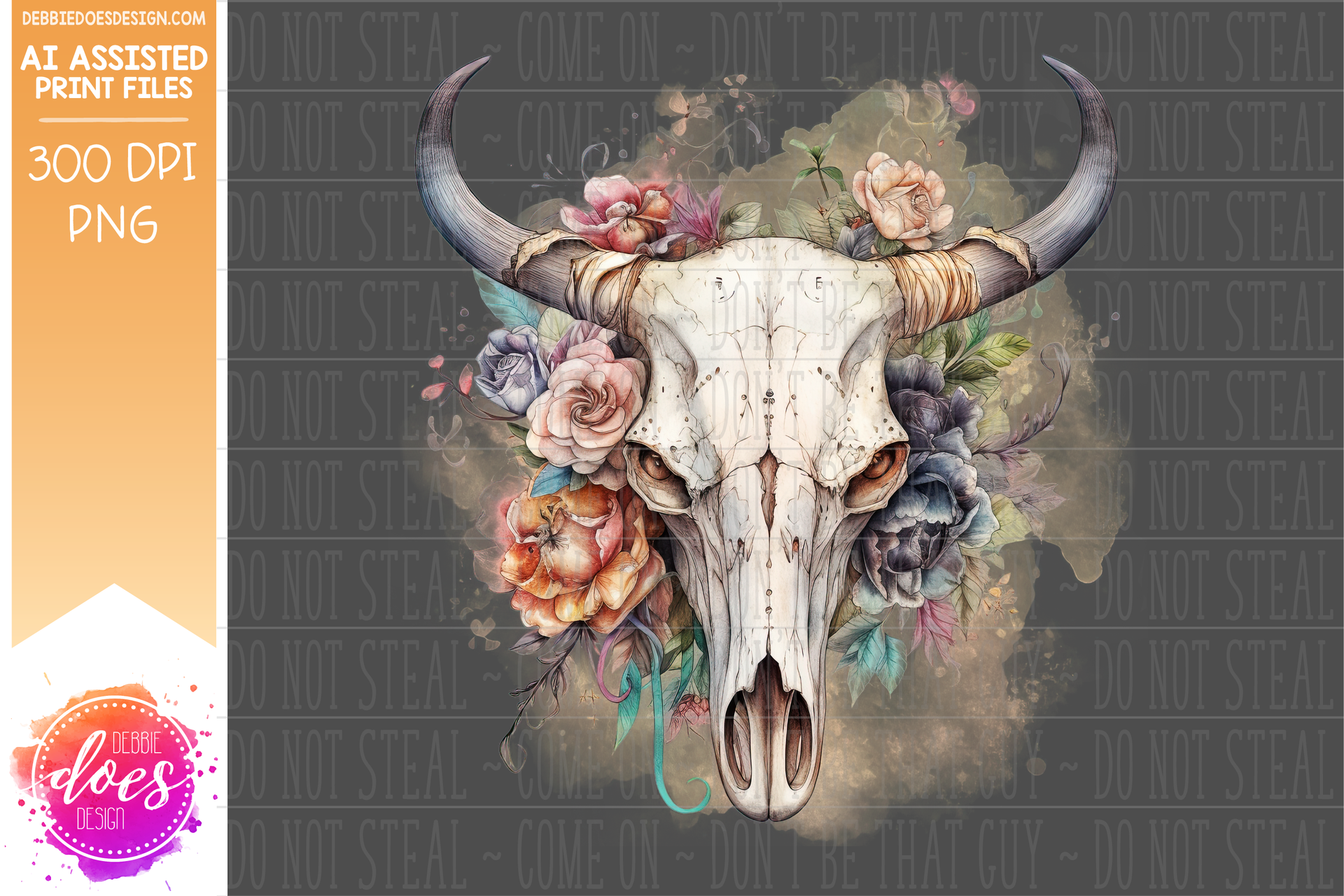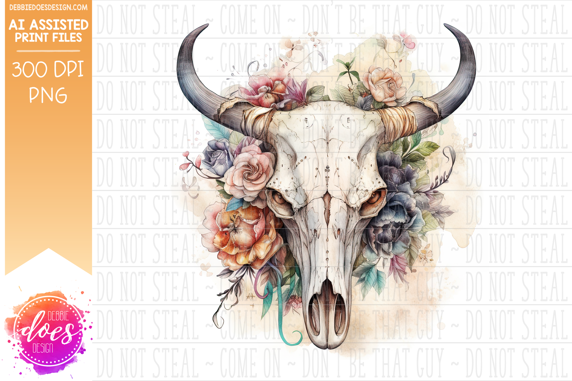 Watercolor Cow Skull and Flowers - Mean but Pretty 2 - Design Elements