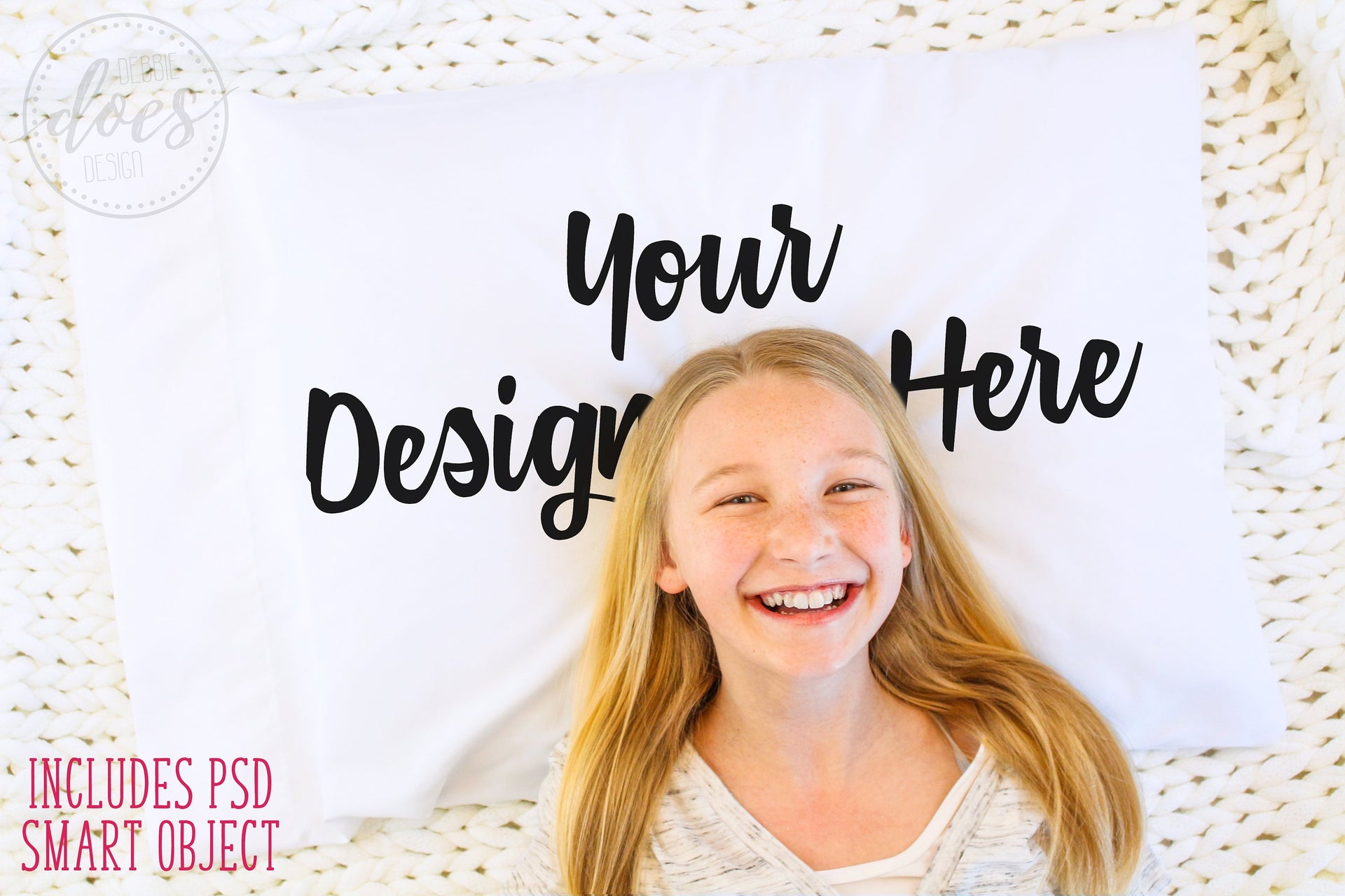 White Pillowcase Mockup with Girl - Includes PSD Smart Object | Bed Pillow Mock-Up
