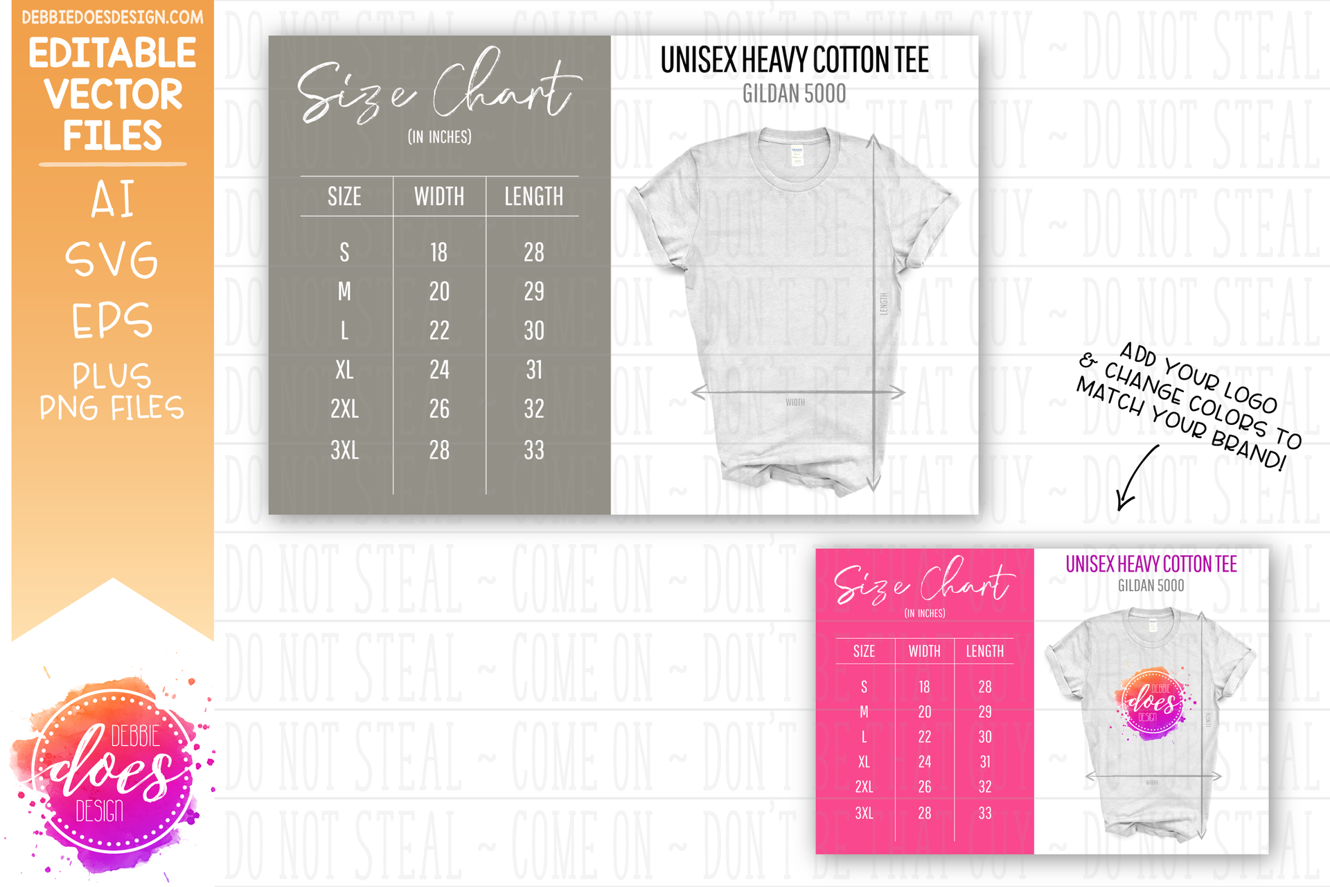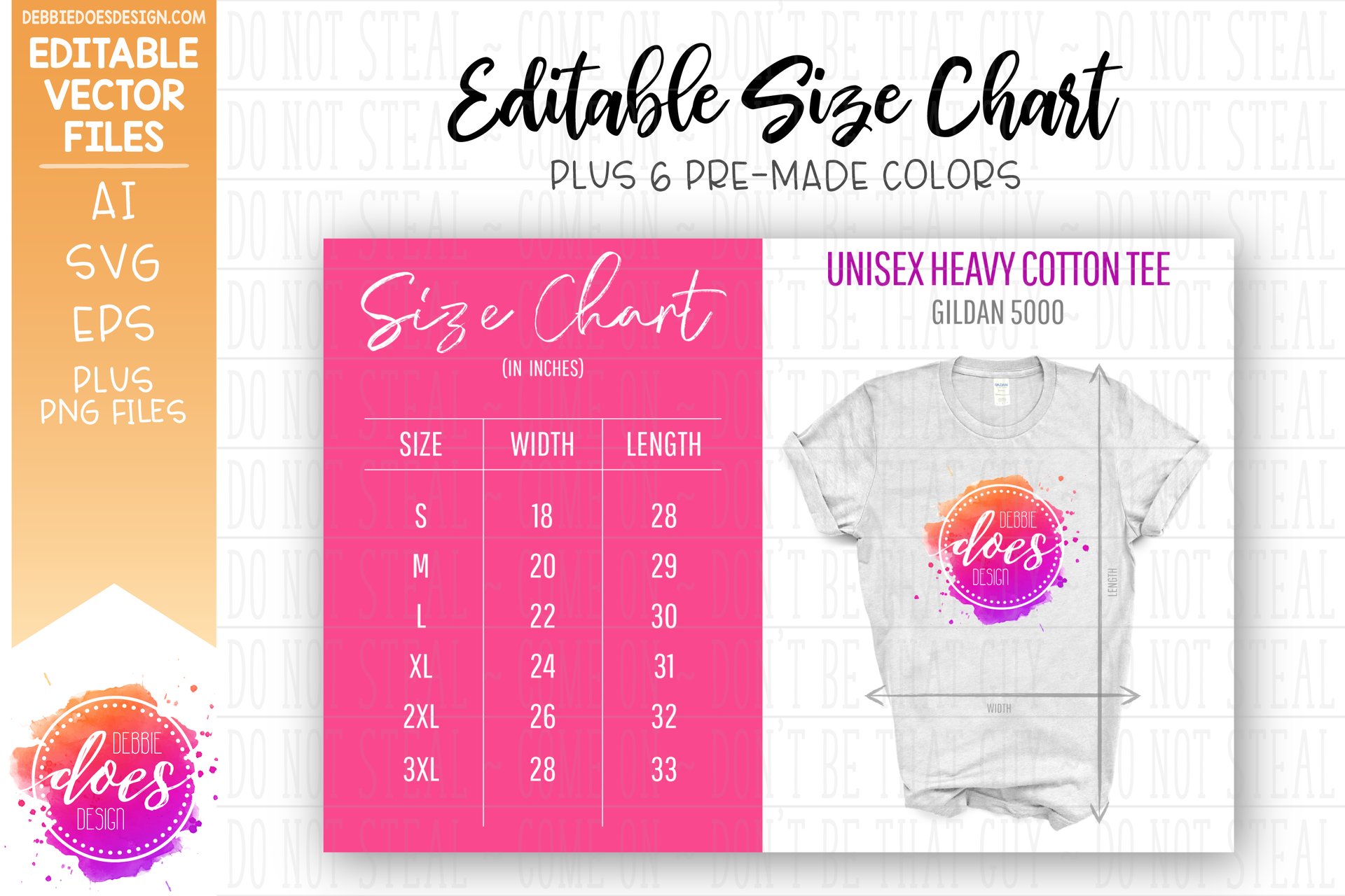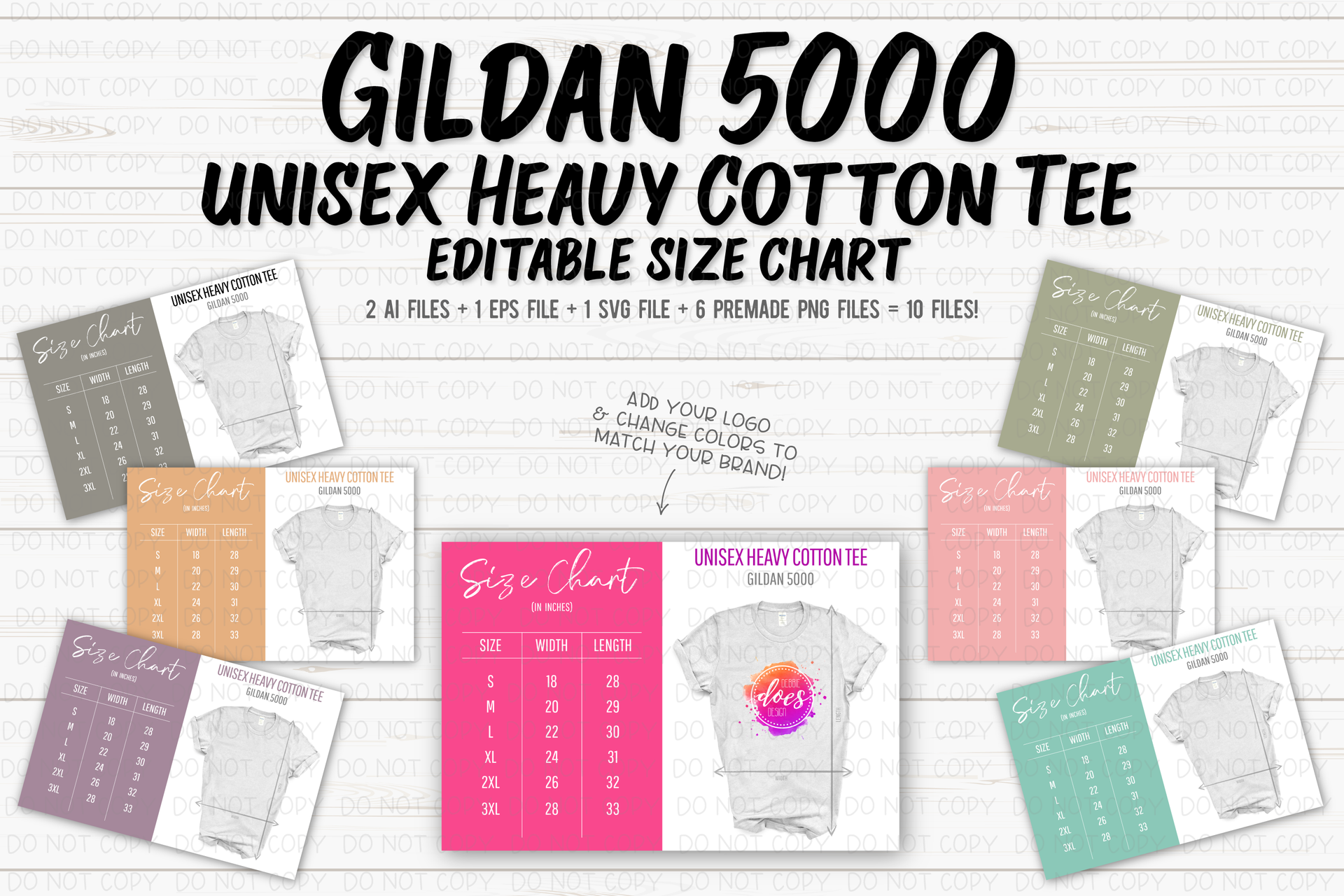 Gildan 5000 - Editable Size Chart + 6 Colored PNG Files