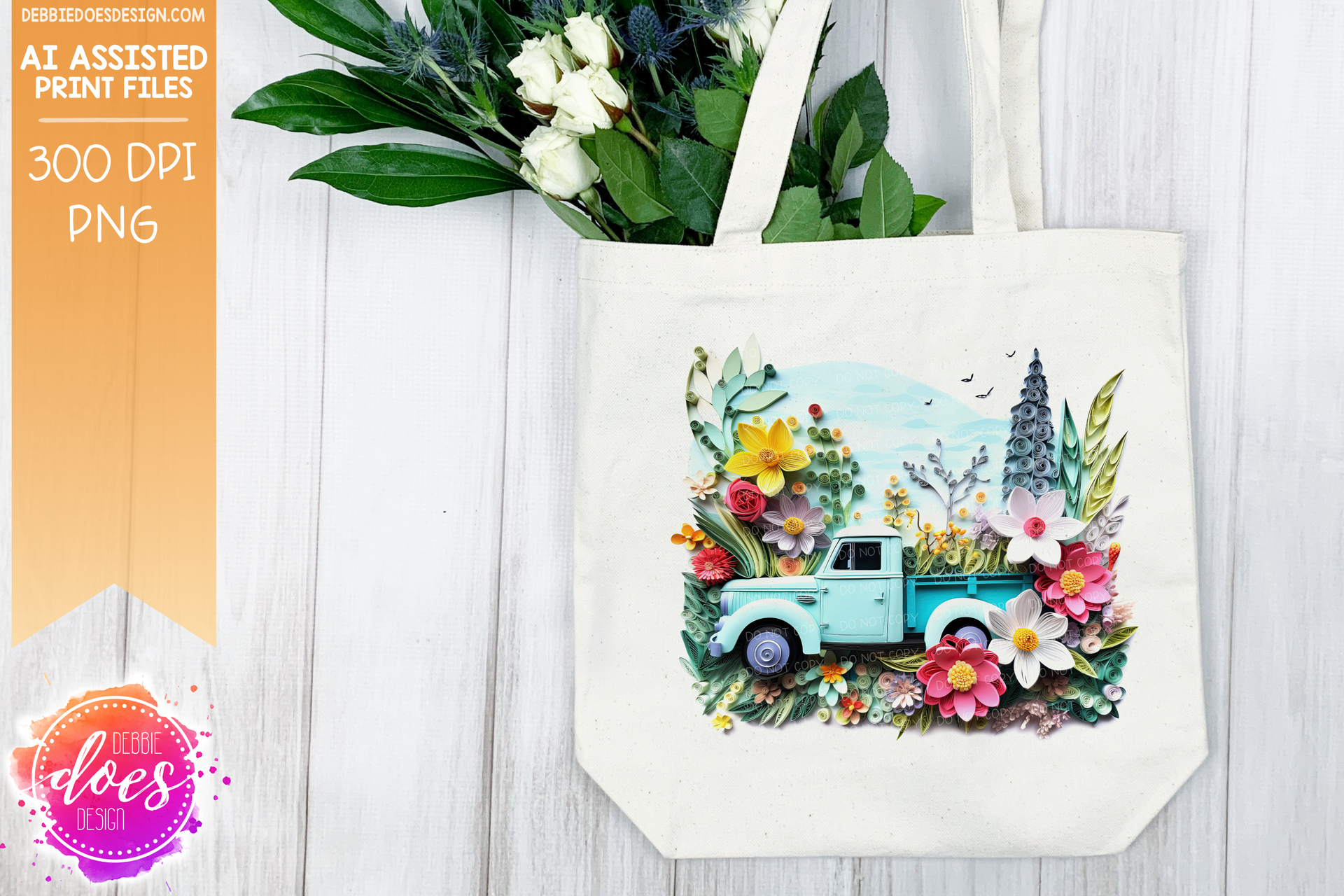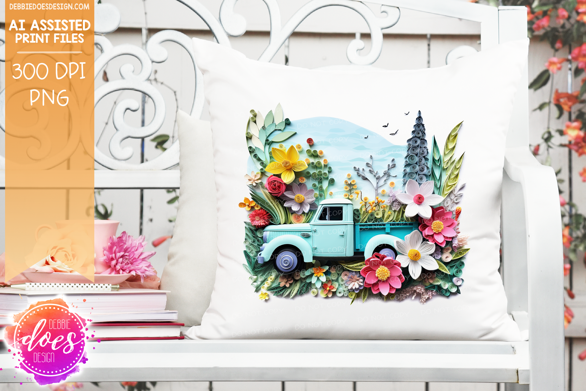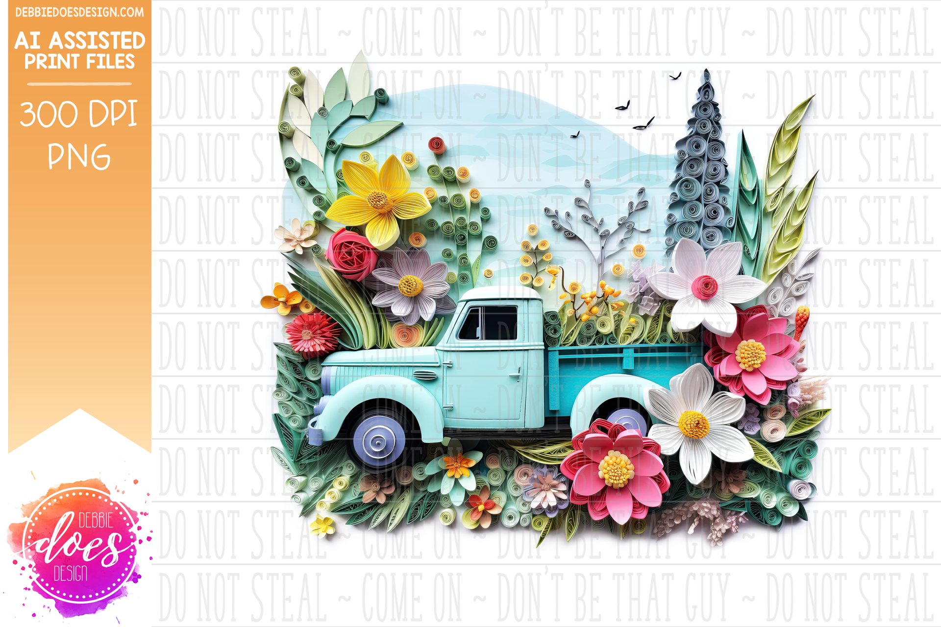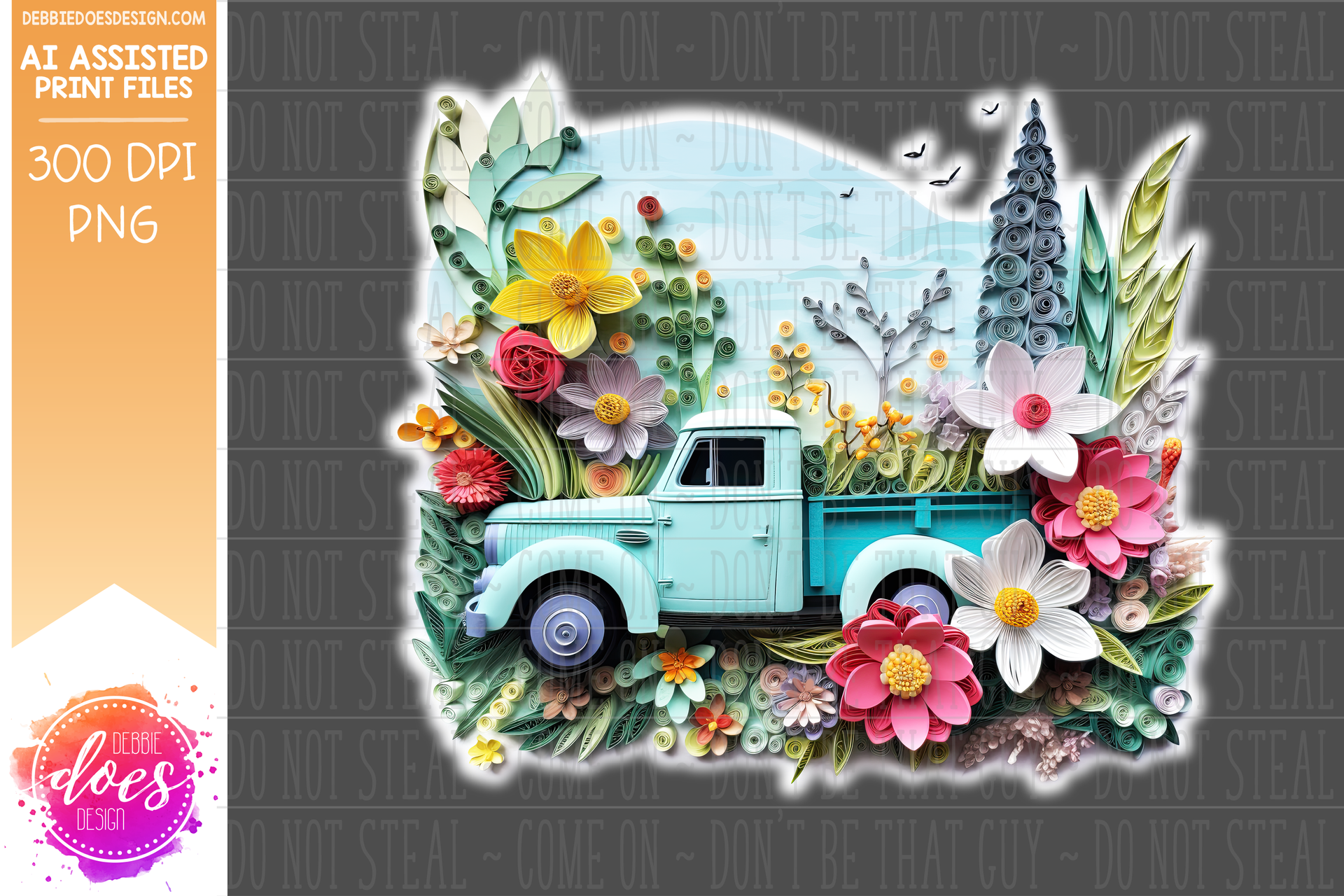Paper Art - Old Blue Truck with Flowers and Trees - White Glow - Design Elements