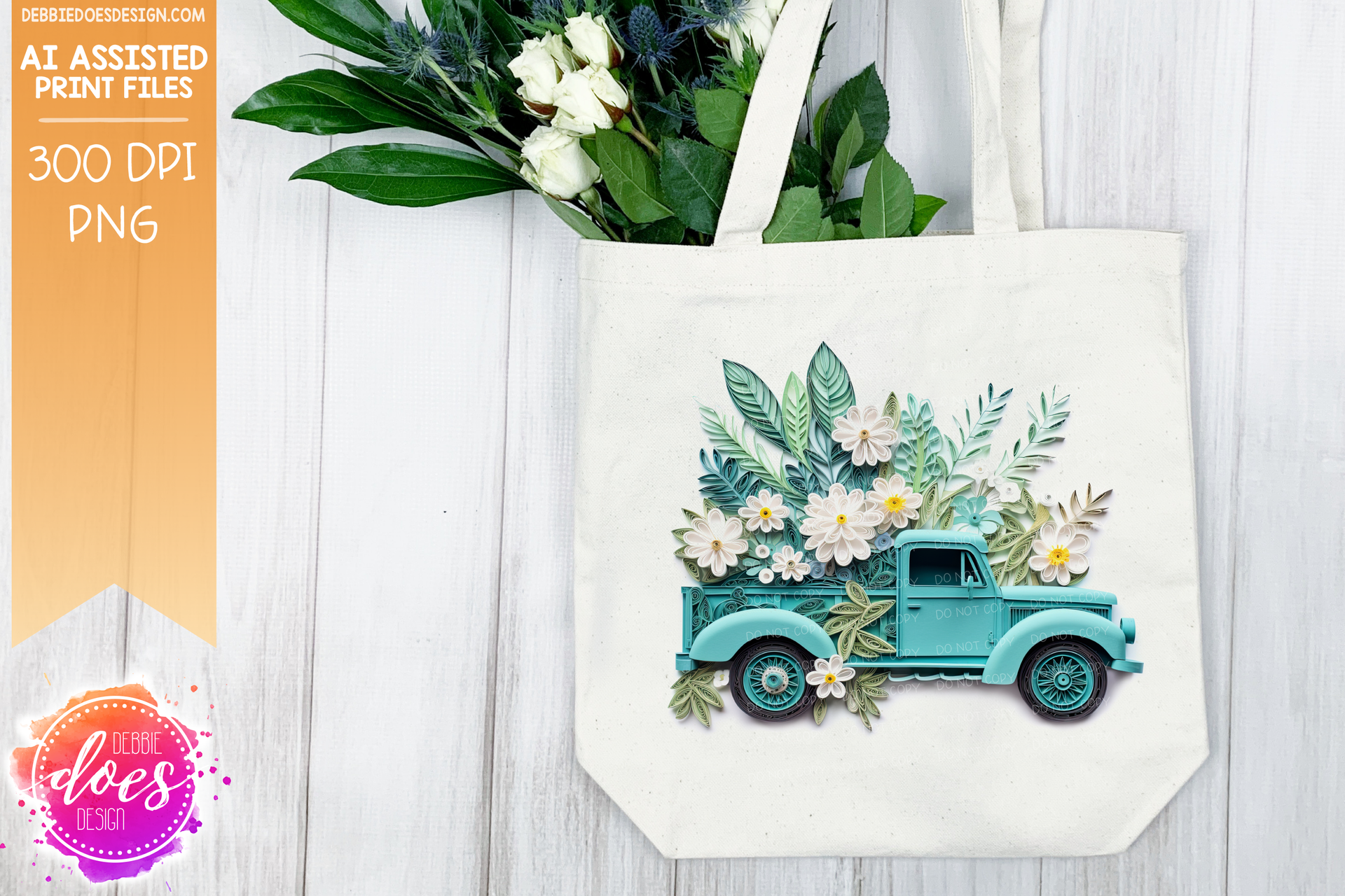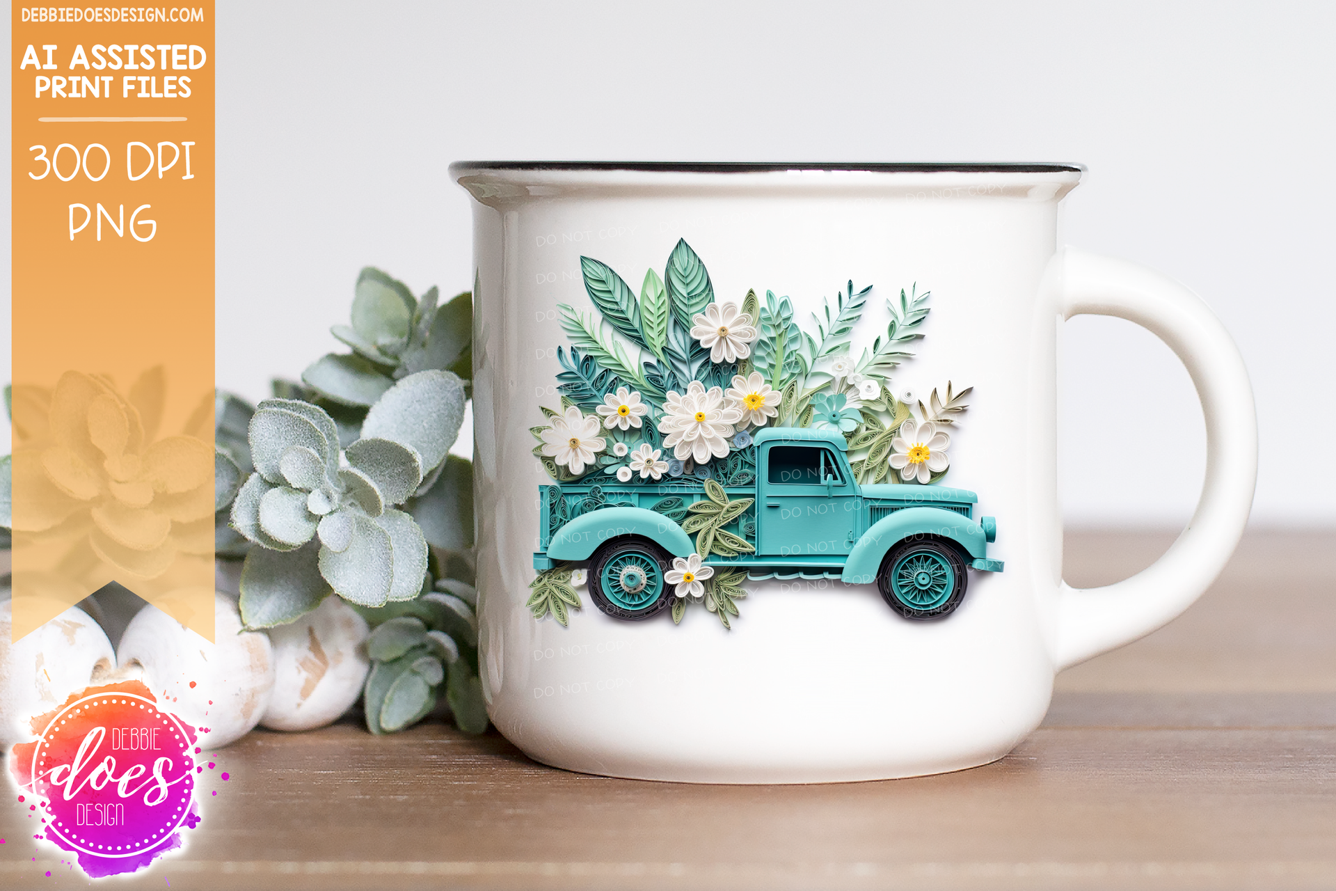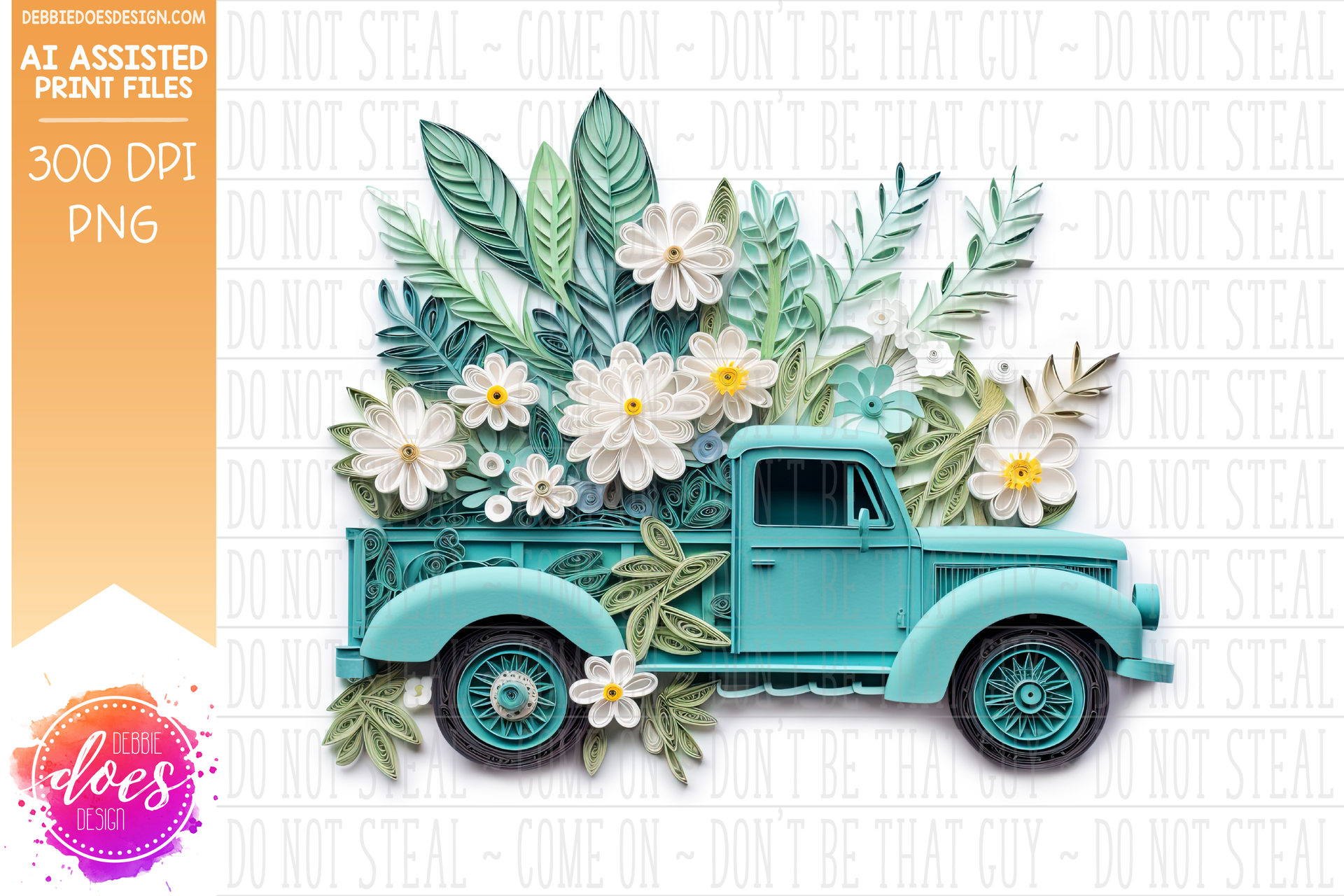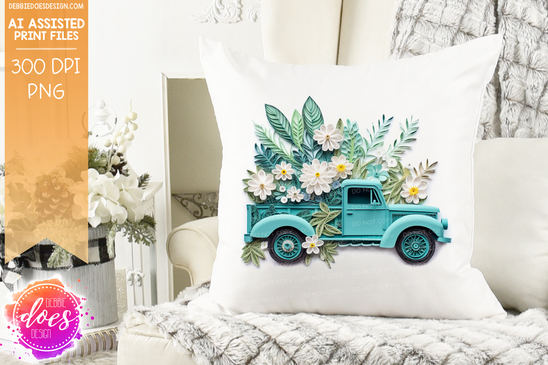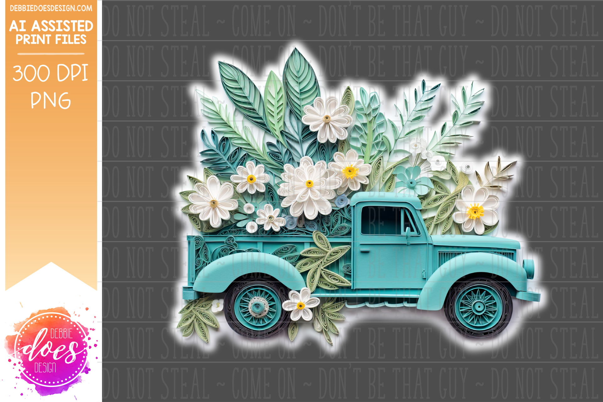 Paper Art - Old Blue Truck with Flowers - White Glow - Design Elements