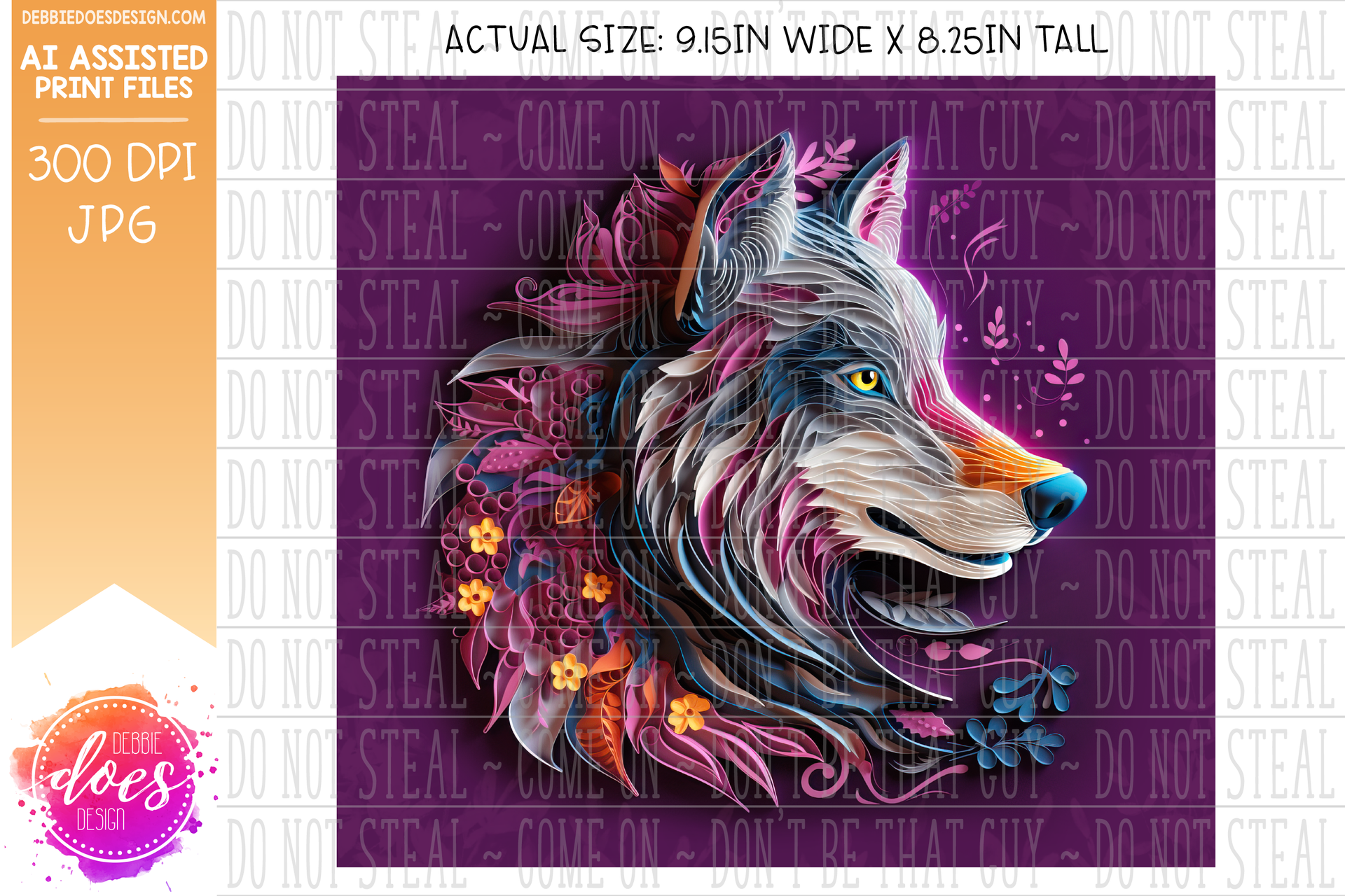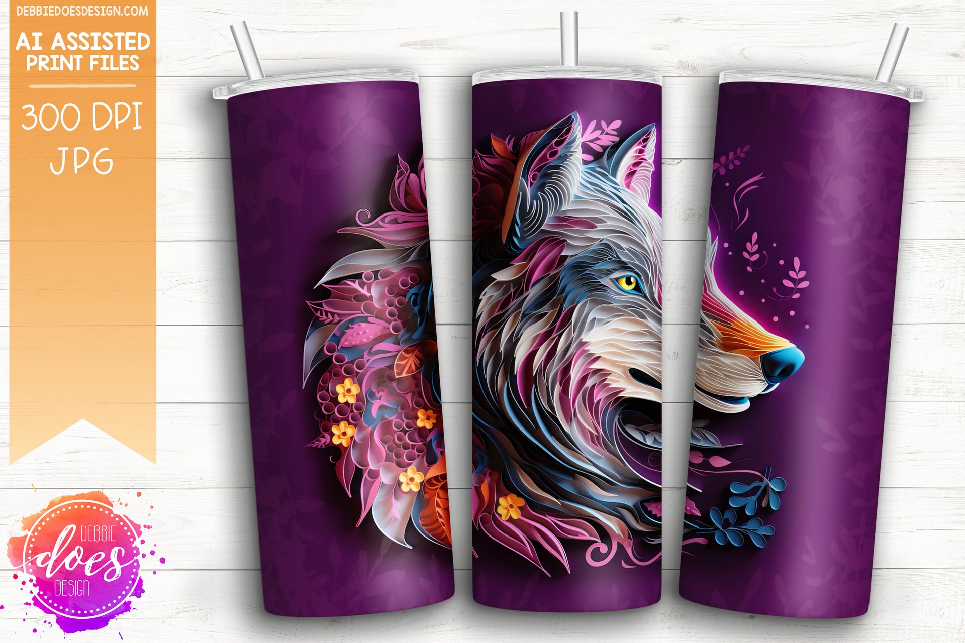 Paper Art - Wolf on Purple with Flowers - Tumbler - Printable/Sublimation Design