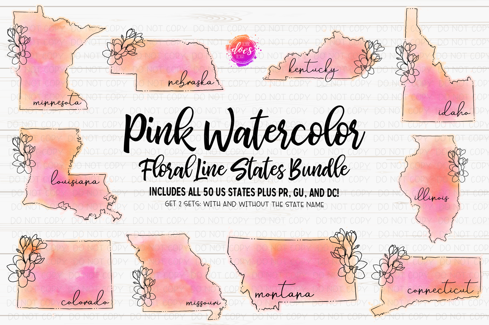 Pink Watercolor Floral Line States Bundle - All 50 States, plus PR, GU & DC! - Sublimation/Printable Designs