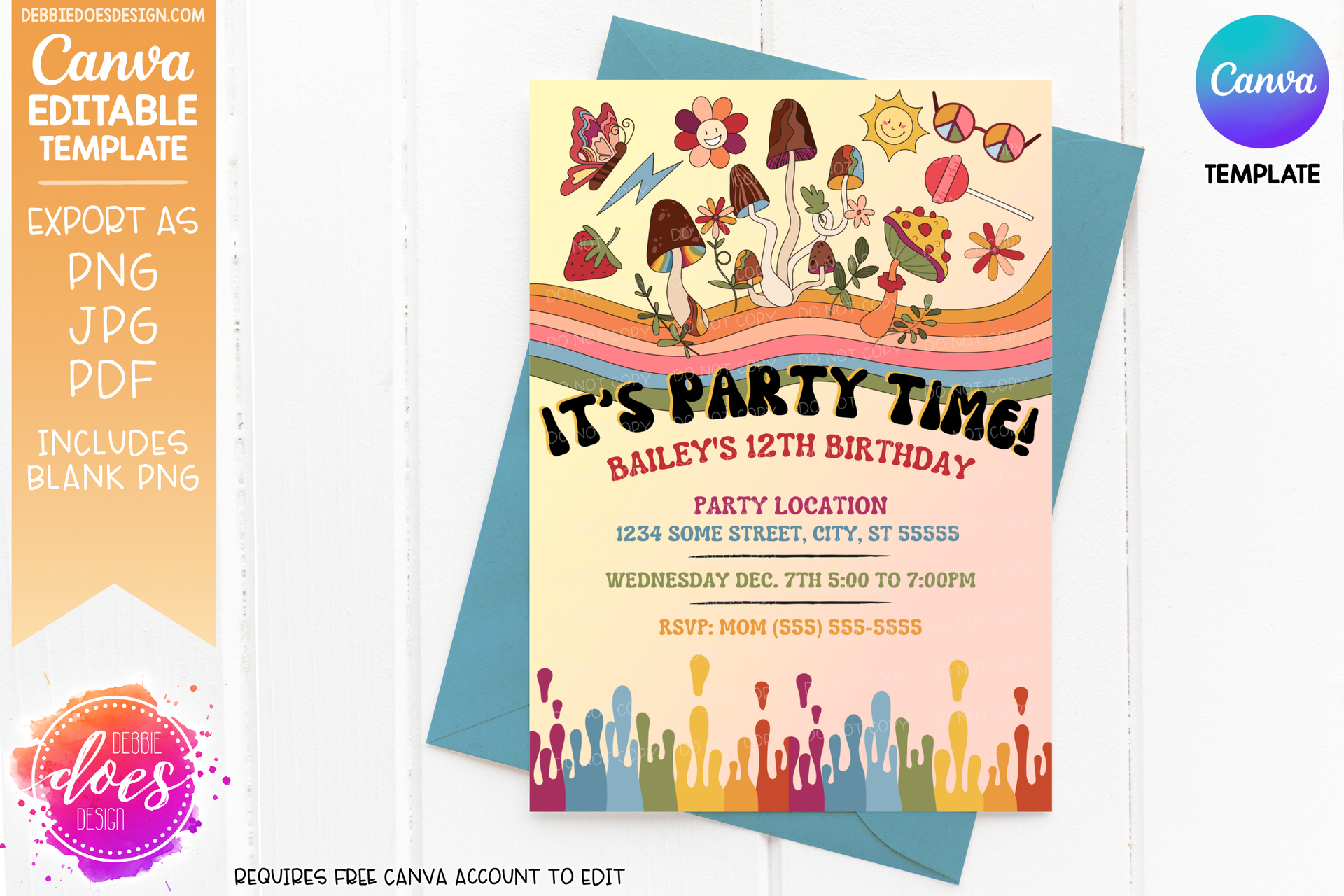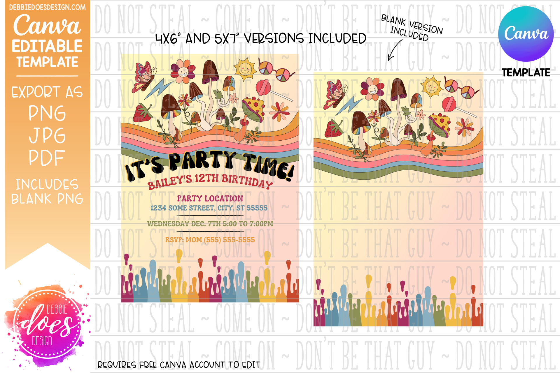 Retro Mushroom Party Invitation - 4x6" & 5x7" Sizes - Canva Template/Printable Design