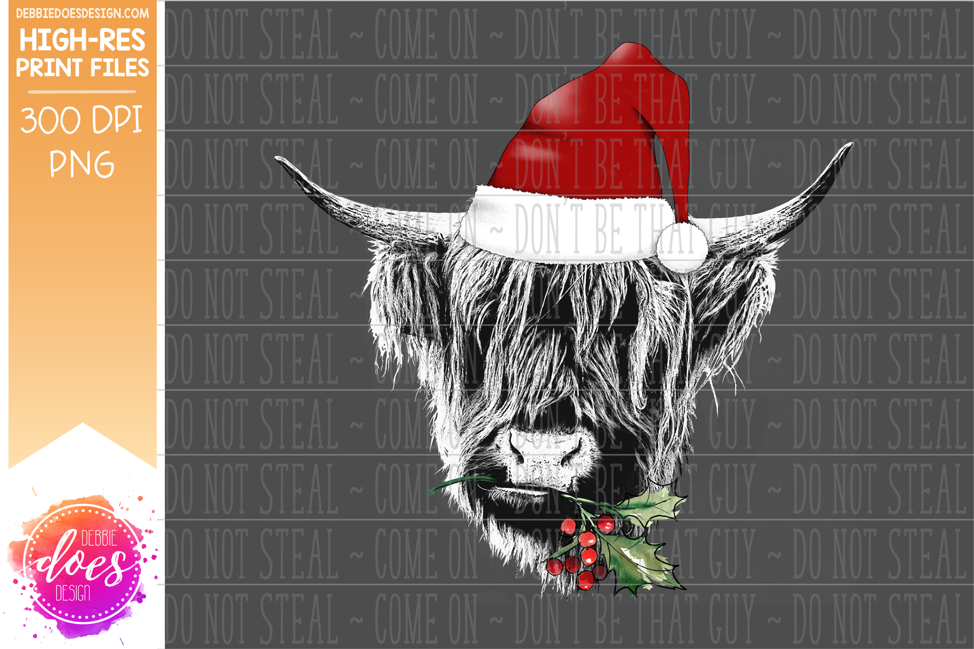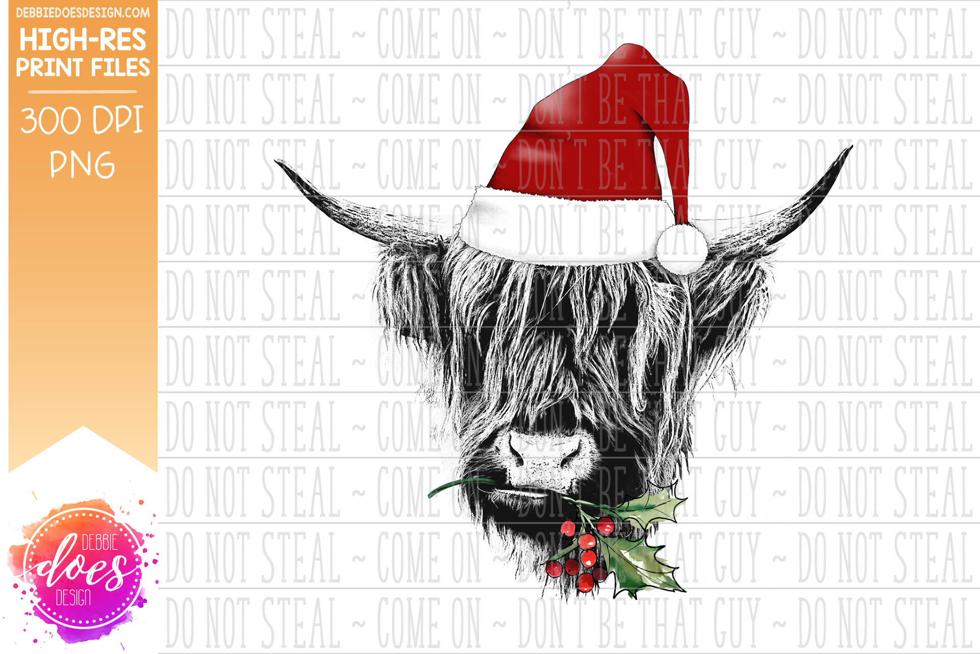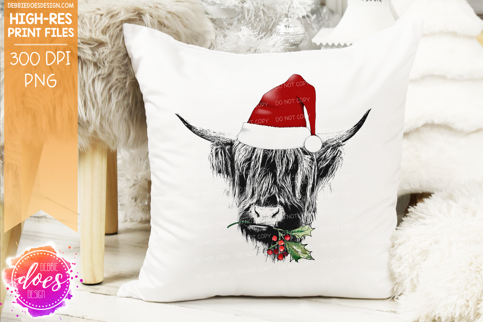 Santa Hat Highland Cow Sketch with Holly - Sublimation/Printable Design