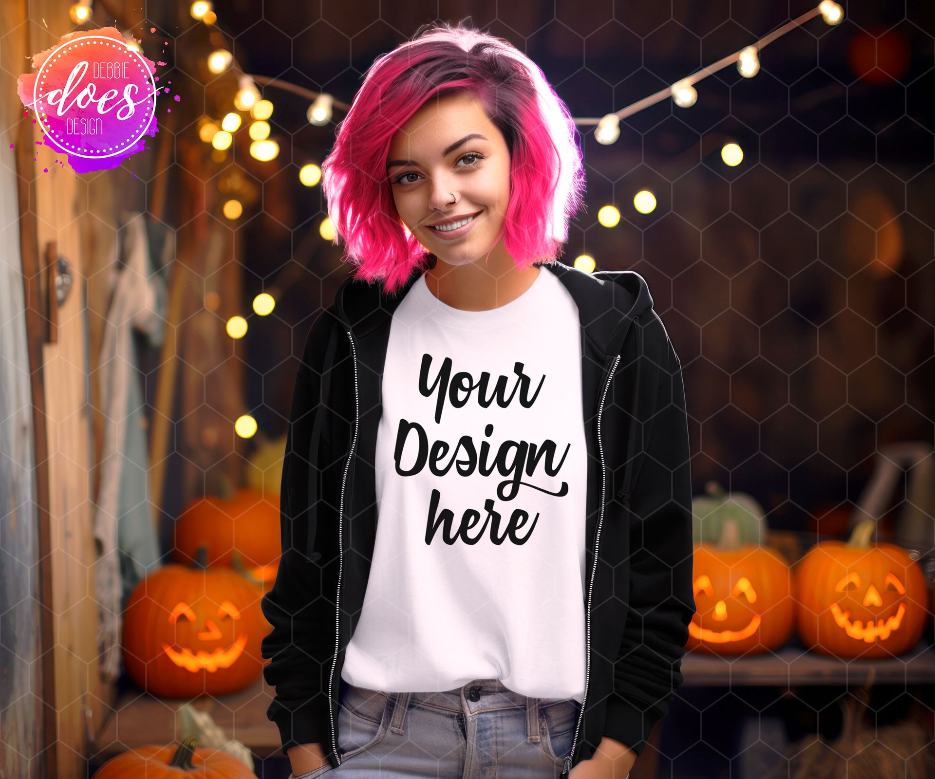 Young Woman Tee Mockup - Halloween - Pink Hair Hoodie